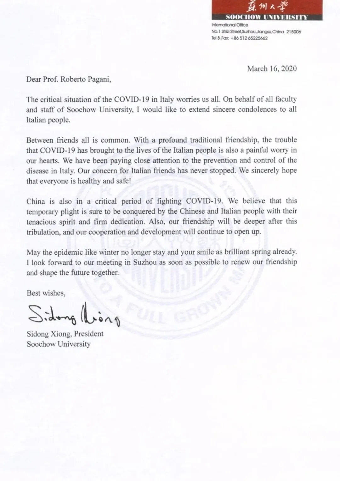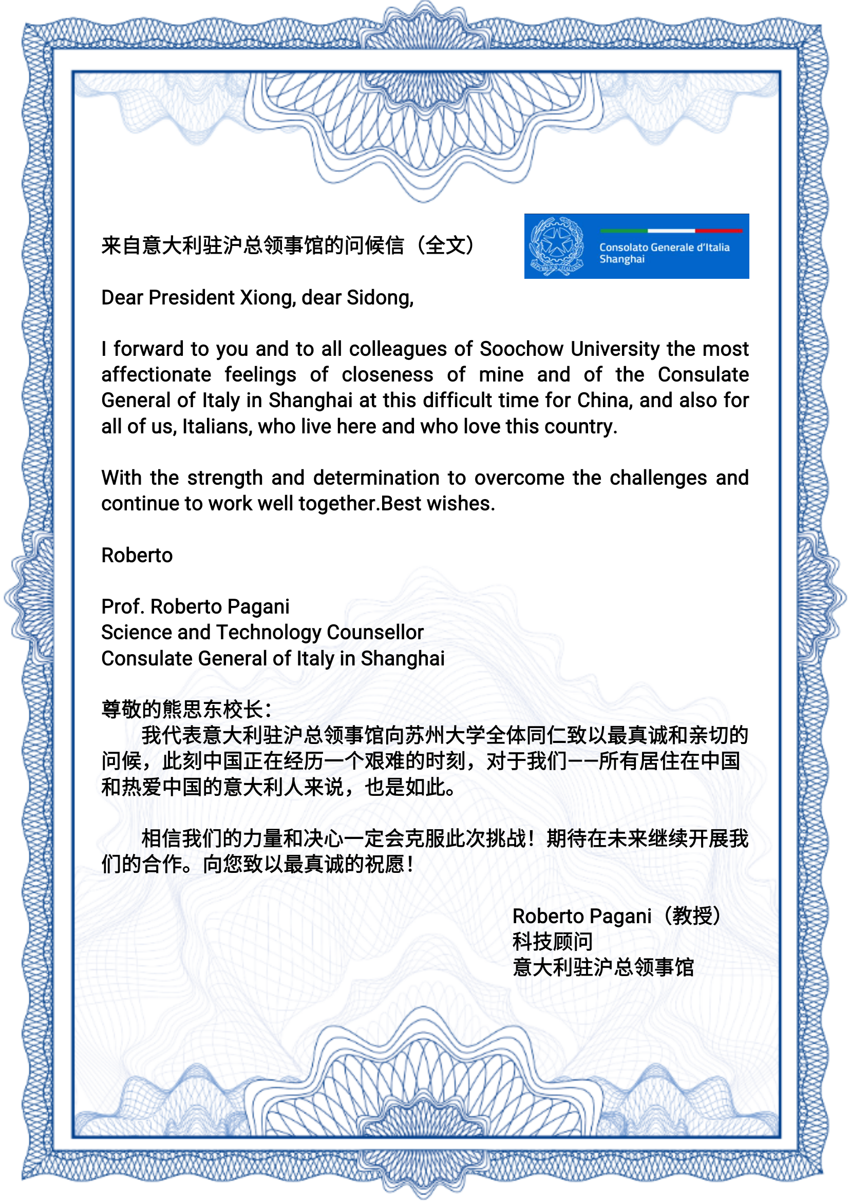 中意友谊源远流长,根基深厚。国内疫情爆发后,意大利驻沪总领事馆在第一时间致信熊思东校长表示慰问。疫情在意大利爆发后,熊思东校长也在第一时间致信问候意大利驻沪总领事馆科技参赞Roberto Pagani,信中表示,九游官网全体师生深切地牵挂着处于危难时刻的意大利人民,希望意大利朋友们顽强奋战,早日战胜疫情!