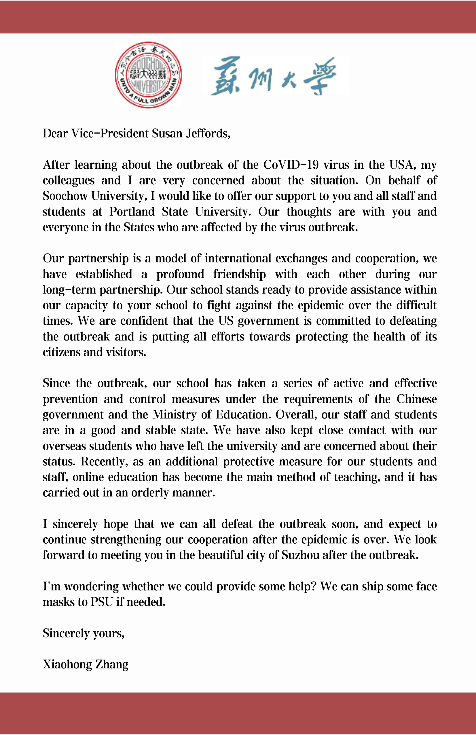 3月初,当美国俄勒冈州因疫情冲击而宣布进入紧急状态时,九游(中国)一站式服务官网党委常委、副校长张晓宏在第一时间向波特兰州立大学教务长兼学术事务副校长Susan Jeffords致信问候,表达对波特兰州立大学全体师生的诚挚慰问,并表示九游官网非常愿意助力波州大共渡难关。