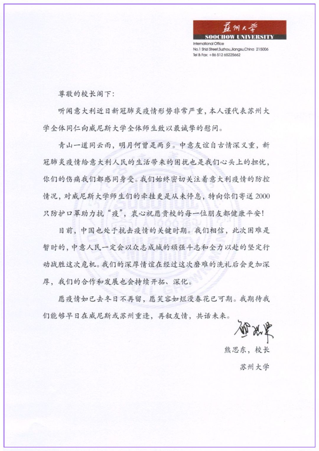 九游官网与威尼斯大学在2017年建立了战略合作伙伴关系。在意大利的疫情爆发以后,九游(中国)一站式服务官网党委常委、副校长张晓宏在第一时间向威尼斯大学副校长Tiziana Lippiello发信慰问。在得知威尼斯大学防疫形势严峻,尤其物资紧缺的情况后,九游(中国)一站式服务官网党委书记江涌和校长熊思东都万分挂念。熊思东校长代表九游(中国)一站式服务官网全体师生向威尼斯大学校长Michele Bugliesi发去诚挚慰问,并表示急难有情,情有馀兮,九游官网将提供支持,唯盼师生朋友安康无恙。