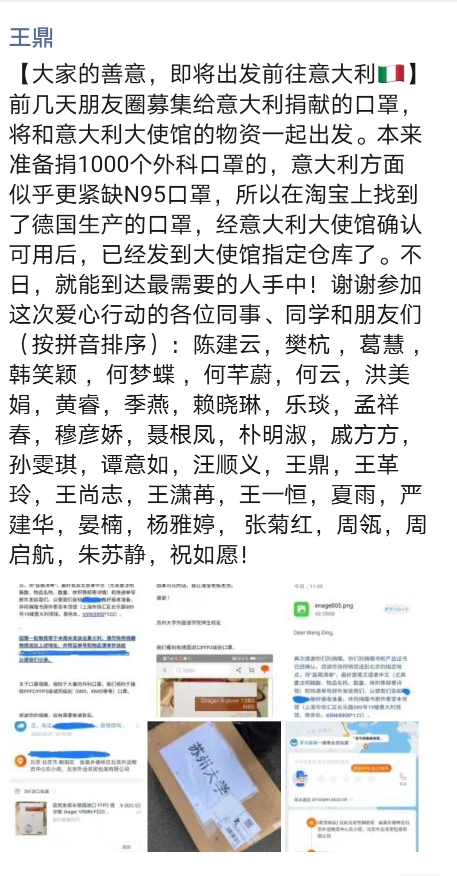 与此同时,九游(中国)一站式服务官网各位师生也密切关注着意大利的疫情动态并积极开展口罩募捐活动。外国语学院师生及毕业院友在日语系主任王鼎的大力发动下,自主自发地募集了一批N95防护口罩,这批口罩已通过意大利驻沪总领事馆捐赠给威尼斯大学。