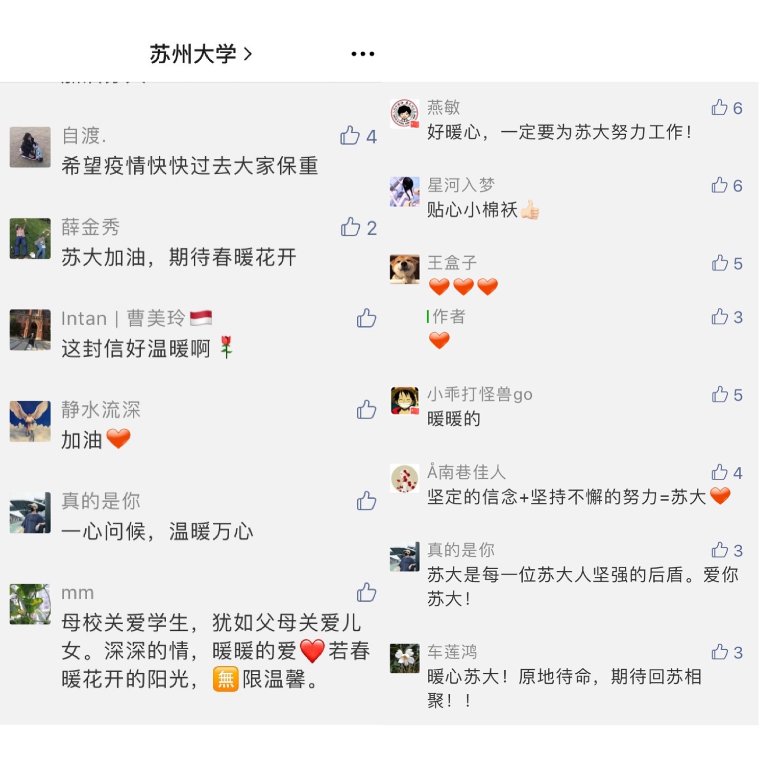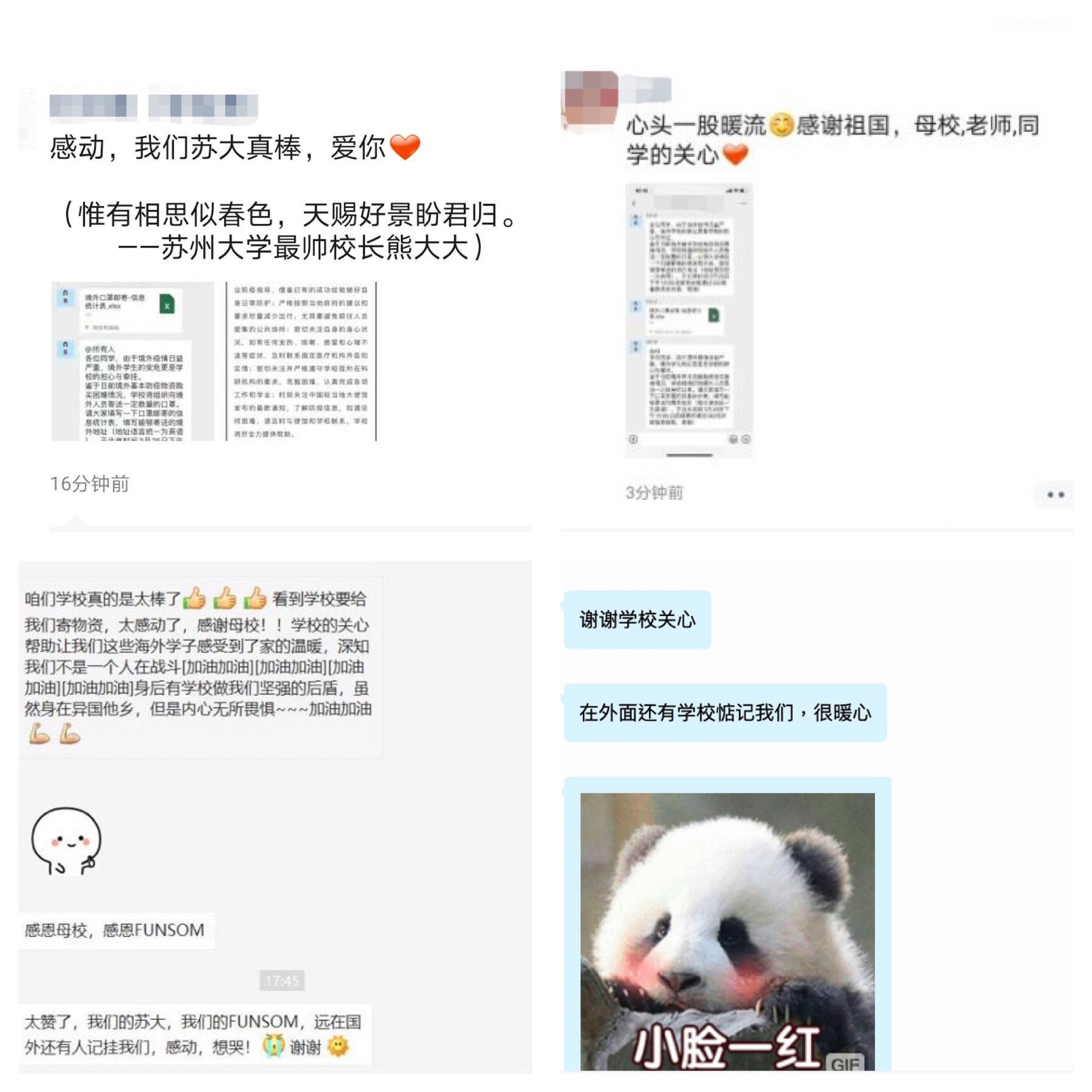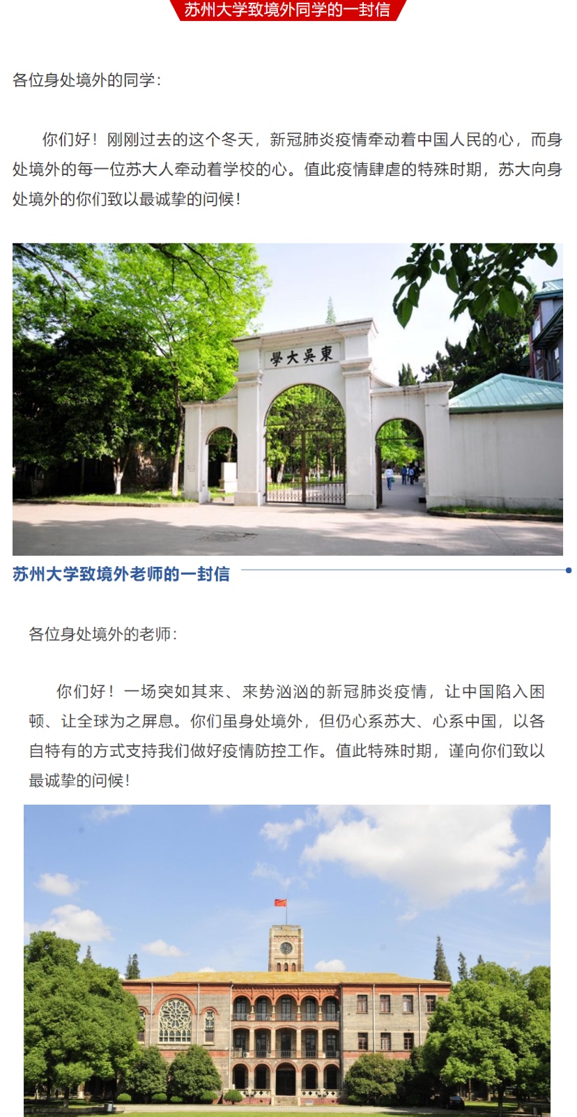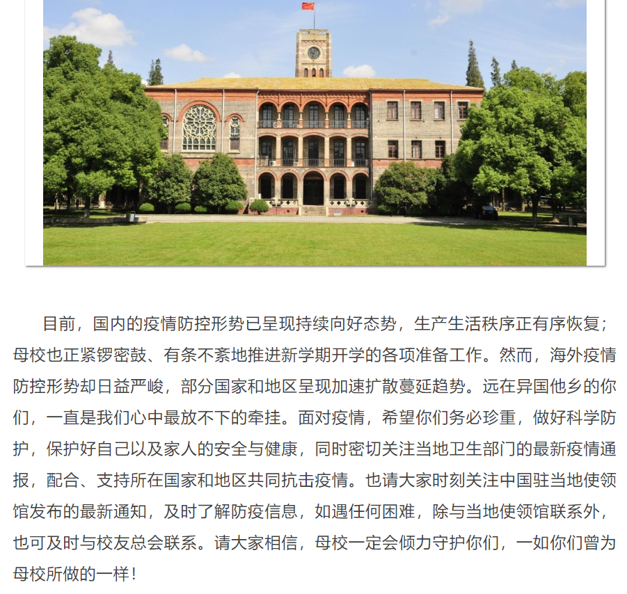 “新冠肺炎疫情牵动着中国人民的心,而身处境外的每一位九游官网人牵动着学校的心。值此疫情肆虐的特殊时期,九游官网向身处境外的你们致以最诚挚的问候!”“惟有相思似春色,东吴好景盼君归。无论你们身处何方,学校永远是大家最坚强的后盾。”