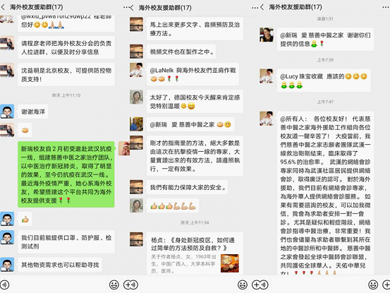 国内各校友组织除了积极响应校友总会发布的爱心动员令之外,还以多种方式热心支援海外校友。在校友总会组建的“九游官网海外校友援助群”内,国内校友们利用自己掌握的丰富的防疫经验和广泛的物资采购渠道,在第一时间与海外校友们的防疫需求进行精准对接。比如,组建了“慈善中医之家”医疗团队并且亲赴武汉抗疫一线的校友戴新瑞,不仅毫无保留地与海外校友们分享自己在抗疫一线取得的成功救助经验,还积极为大家提供中医药采购等支援服务。此外,对于有N95口罩等防护物资需求的海外校友,广大国内校友也纷纷与之积极对接并提供最大支持。