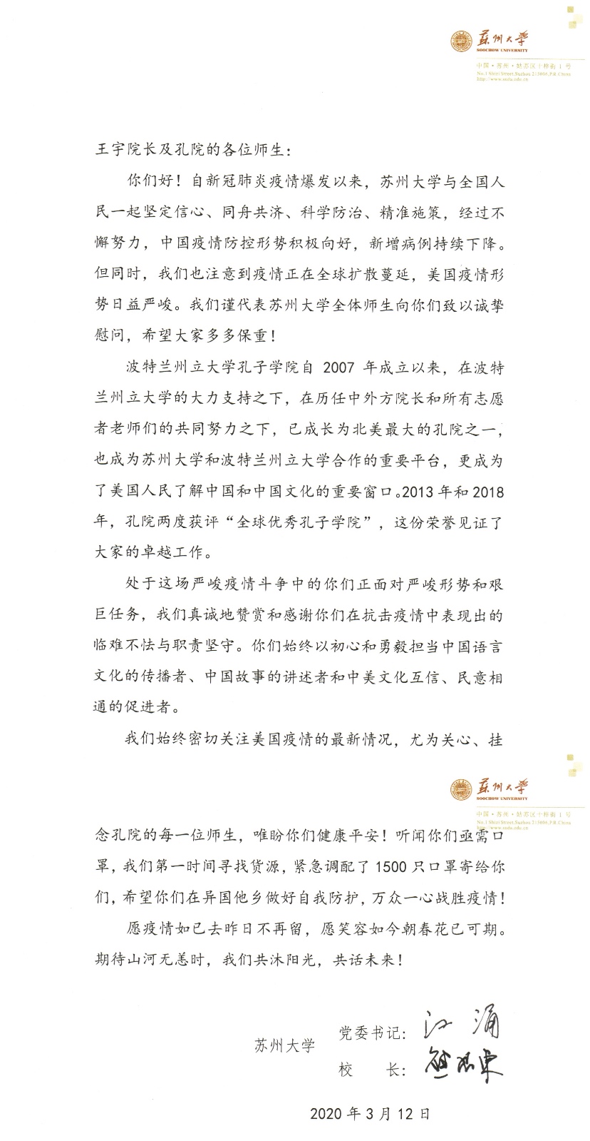 党委书记江涌、校长熊思东高度重视波特兰州立大学孔子学院的疫情防控情况,并及时发信慰问孔院全体师生。