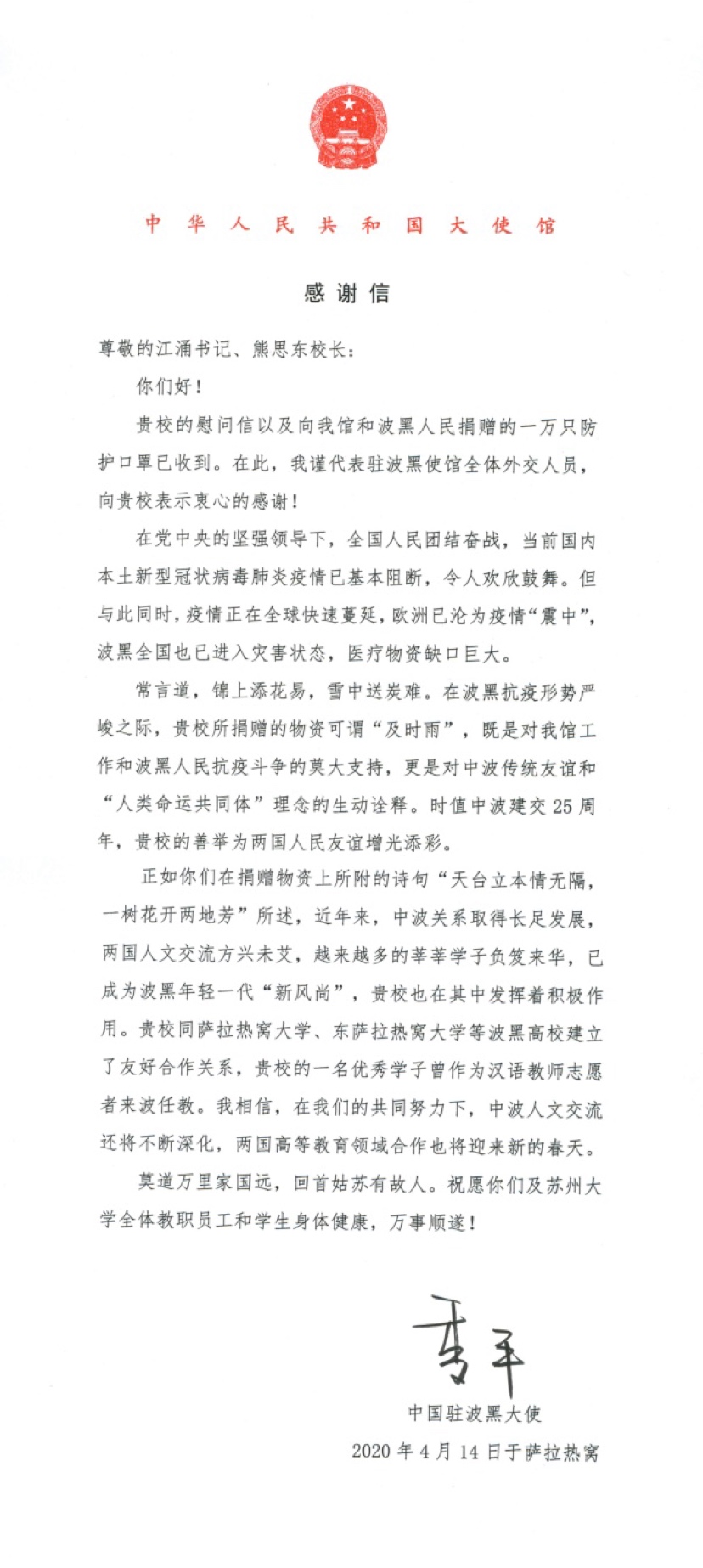 3.中国驻波黑大使馆向九游(中国)一站式服务官网发来感谢信:莫道万里家国远,回首姑苏有故人。