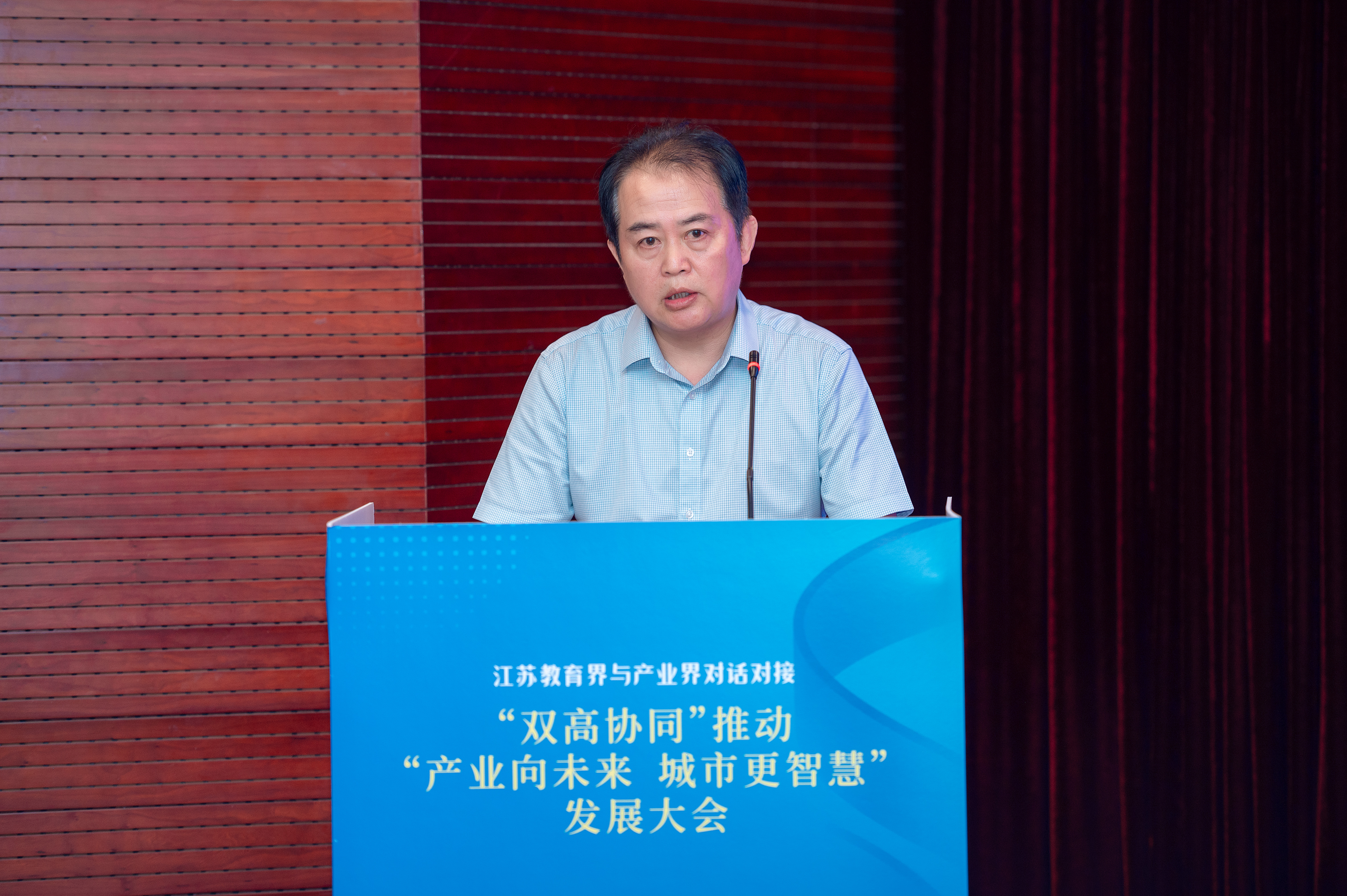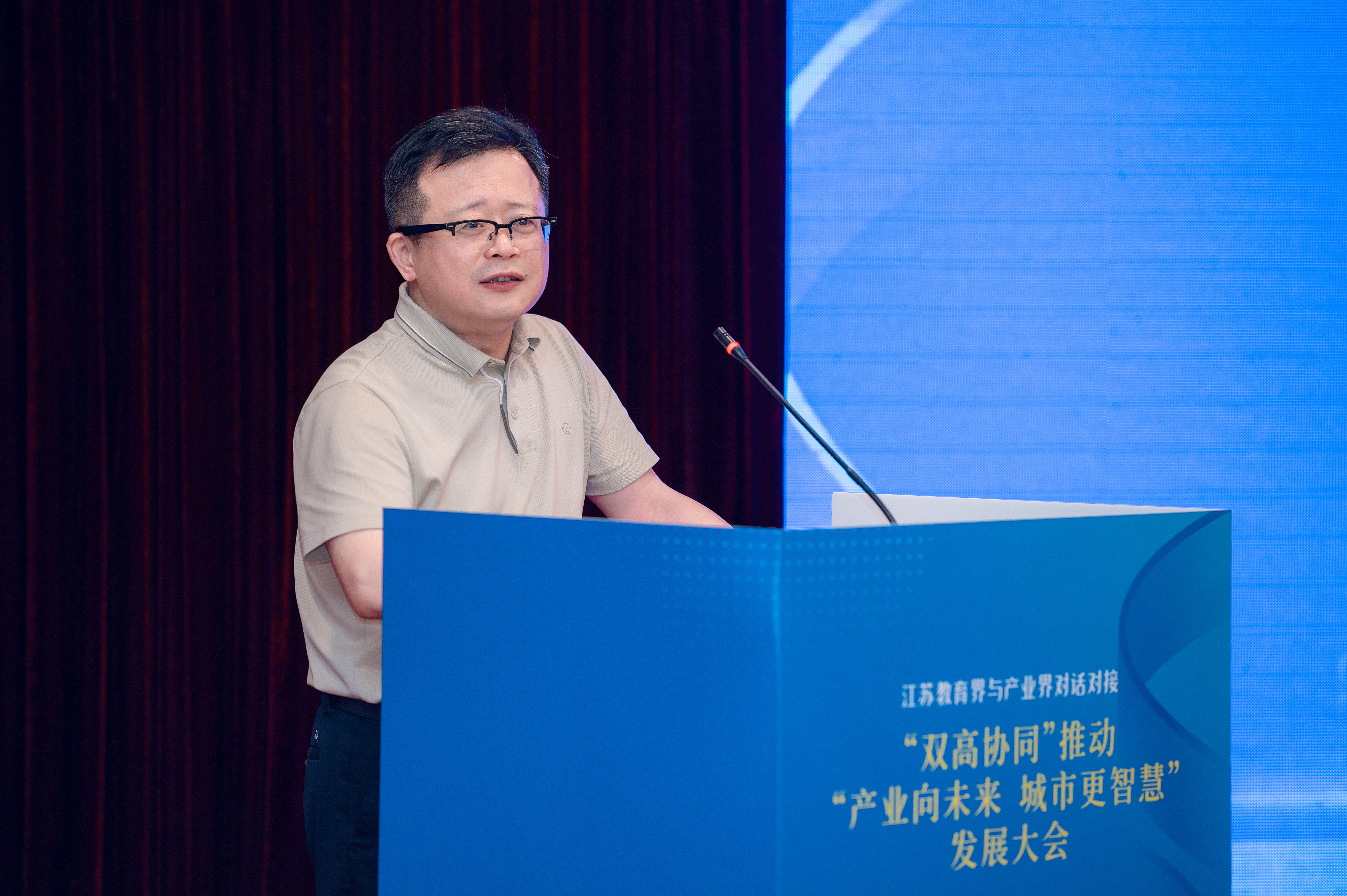 张正彪对与会领导和嘉宾的到来表示欢迎。他指出,学校始终以服务区域发展为核心使命,从“研”“产”“用”“育”四个方面助力城市数字化转型。未来学校将继续发挥自身优势,搭建教育、产业与政府的协同桥梁,为江苏高质量发展注入新动能。