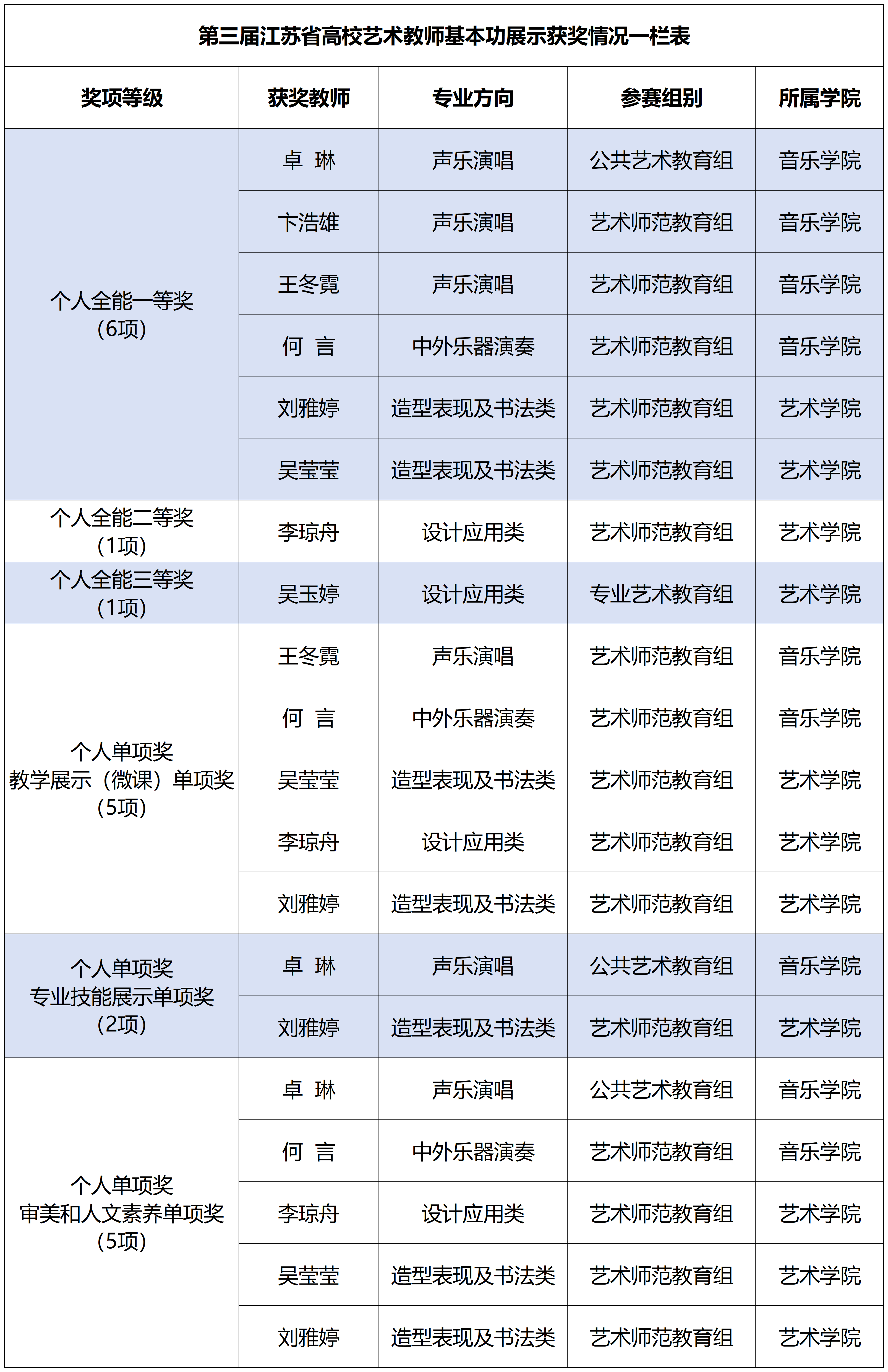 近日,省教育厅办公室发布《关于公布第三届江苏省高校艺术教师基本功展示获奖结果的通知》,九游(中国)一站式服务官网艺术教师团队在本届展示中表现卓越,斩获20项大奖,在全省高校中成绩名列前茅,整体获奖质量和数量实现新突破。其中,个人全能奖8项,包括一等奖6项(含全省排名第1名、第2名和第3名各1人),二等奖1项,三等奖1项;个人单项奖12项,包括教学展示(微课)5项、专业技能展示2项、审美与人文素养展示5项。根据赛事安排,九游(中国)一站式服务官网将选派两名教师(音乐教育专业、美术教育专业各1名)代表江苏省参加2025年全国高校音乐教育专业、美术教育专业教师基本功展示。