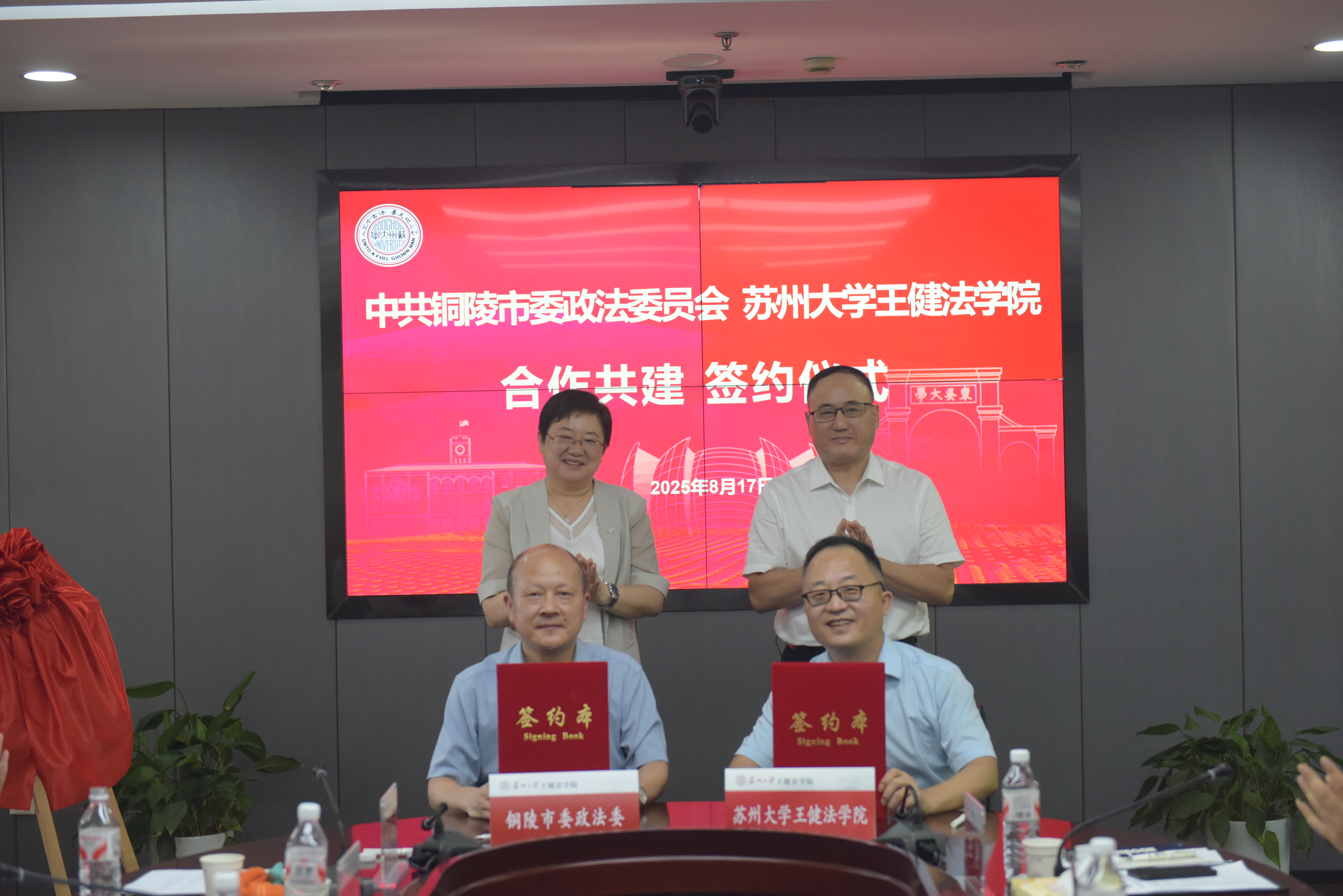 铜陵市委政法委常务副书记荣胜与王健法学院院长程雪阳共同签署合作共建框架协议,昌红梅、宫向阳共同见证。双方将深化常态交流,协同开展干部教育培训、法治人才培养、司法实务研究、平安创新实践等工作。会上,双方就法学教育与法治实践的互促共进展开深入交流,高度认同深化合作对推动法学教育革新与地方法治建设的重要意义。