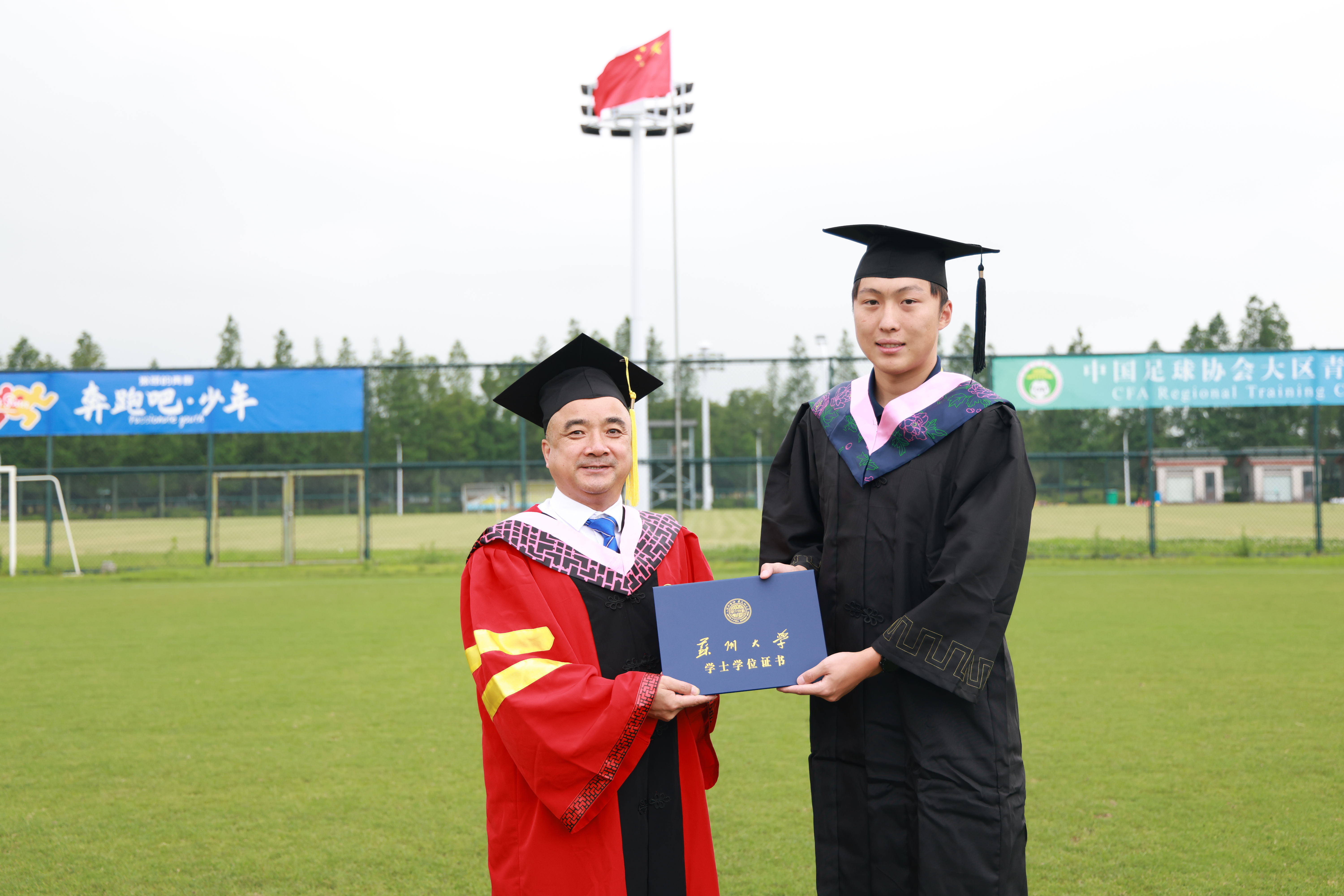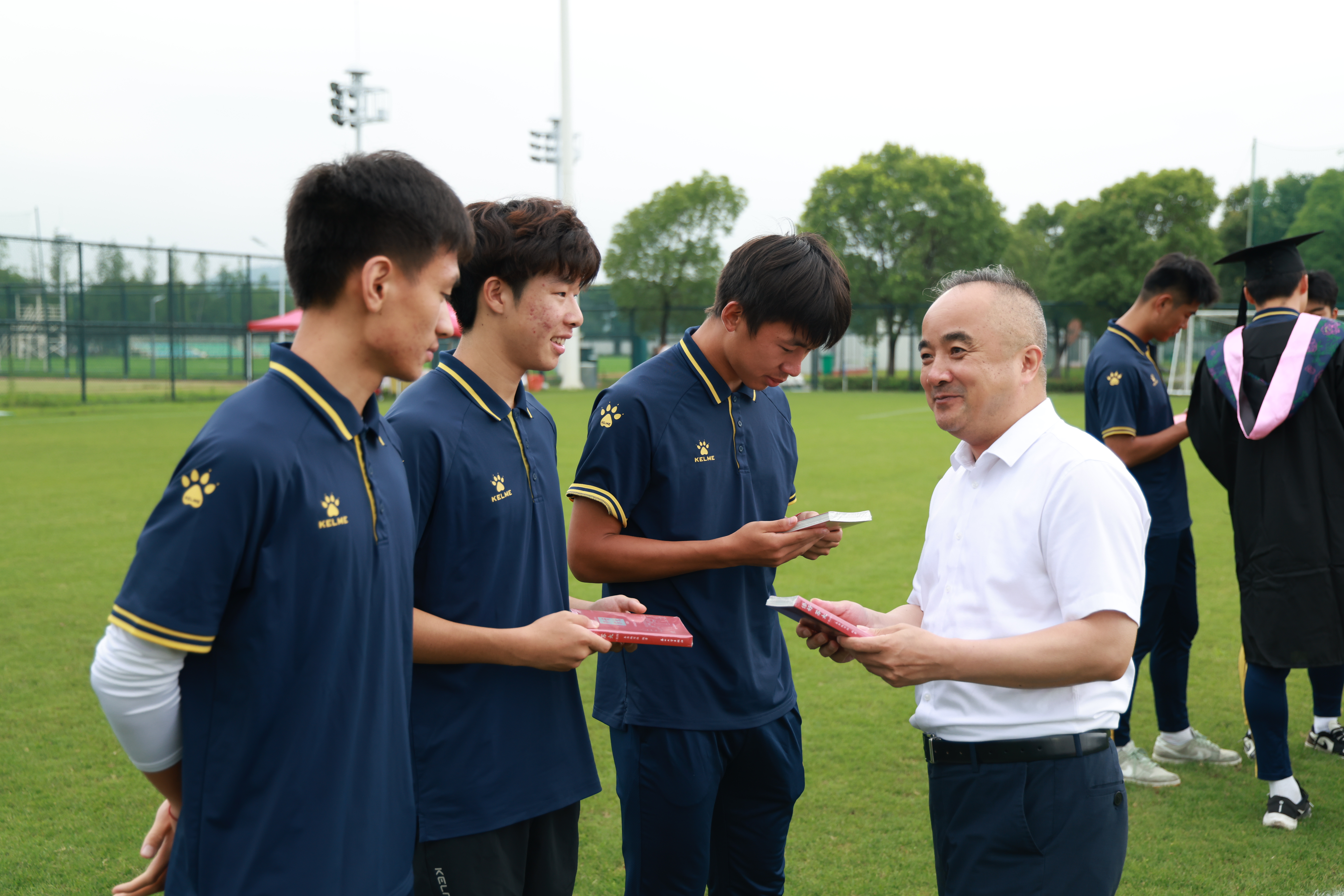 6月23日,一场特殊的毕业典礼在苏州太湖足球运动中心进行。 九游官网党委常委、副校长查佐明来到训练场上,为该校应届本科毕业生、“苏超”联赛苏州队门将纪振勇拨穗。