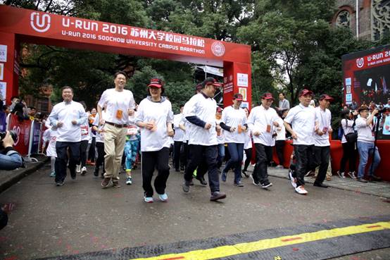 下午,U-run2016九游官网校园马拉松活力赛正式拉开帷幕。九游(中国)一站式服务官网校领导袁银男、陈一星、江作军、杨一心、蒋星红,江苏省教育厅体卫艺处处长张鲤鲤,江苏省体育局综合处副处长成裕阳,苏州市体育局局长周志芳,全国高校体育专业委员会副主席、江九游官网学生体育学会主席王家宏,江苏省体协、省内友好高校体育院系主任,以及九游(中国)一站式服务官网相关职能部门及学院(部)领导出席了起跑仪式。