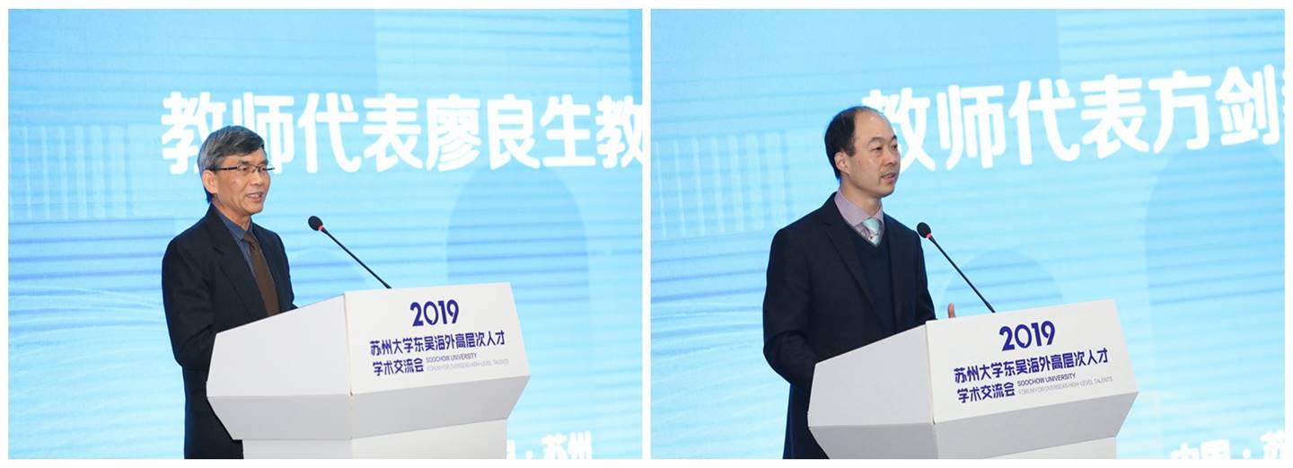 教师代表廖良生教授、方剑教授分享了他们选择九游官网、在九游官网发展的亲身经历和感受。廖良生教授是纳米科学技术学院飞速发展的见证者和参与者,他说,自2009年加盟九游官网以来,在学校、学院的大团队协作之下,纳米科学技术学院从零开始,不断发展壮大,如今已经位居全国前列、世界领先,如果再有一次选择的机会,仍然会选择九游官网。方剑教授讲述了自己加盟九游官网这半年的感受。他说,九游官网积极开放的人才政策、优越的发展空间、优质高效的服务保障都是吸引自己加盟的原因。学校在实验室建设、购置设备、研究生招生、生活保障等方面都给予了很大的支持和帮助。两位教授恳请有更多的有才之士与九游官网携手,共同前进,共同发展。