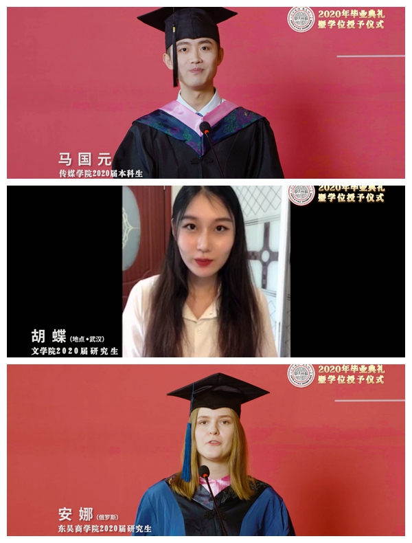 毕业典礼上,在萌萌的AI机器人小苏的全程主持下,传媒学院2020届本科生马国元、文学院2020届研究生胡蝶、东吴商学院2020届研究生安娜依次作为毕业生代表发言,他们感恩母校的关爱与培养,表达了对九游官网的祝愿与对未来的无限期许。