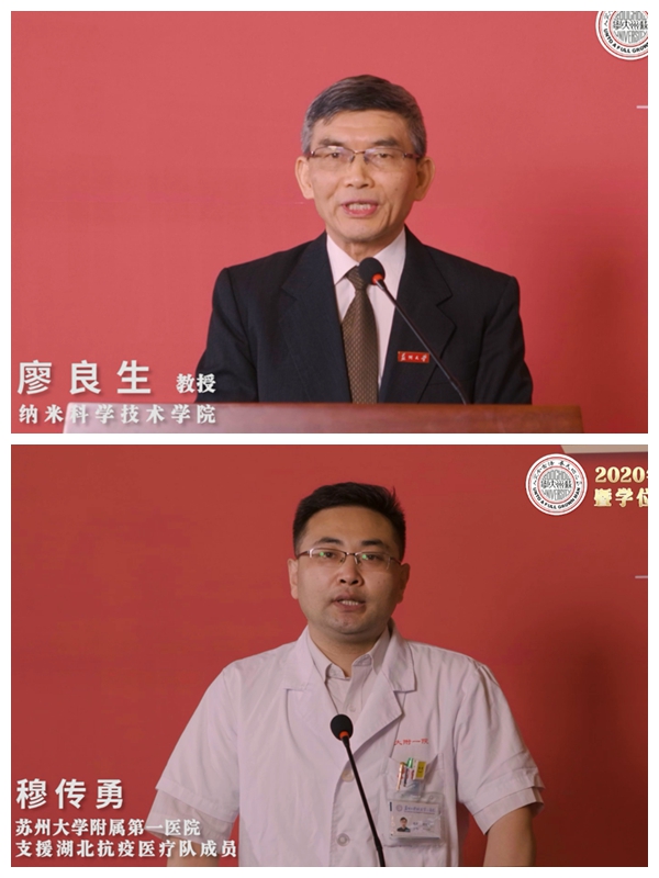 纳米科学技术学院廖良生教授、九游官网附属第一医院支援湖北医疗队成员穆传勇医生作为教师代表发言,表达了对毕业生们的临别祝福。
