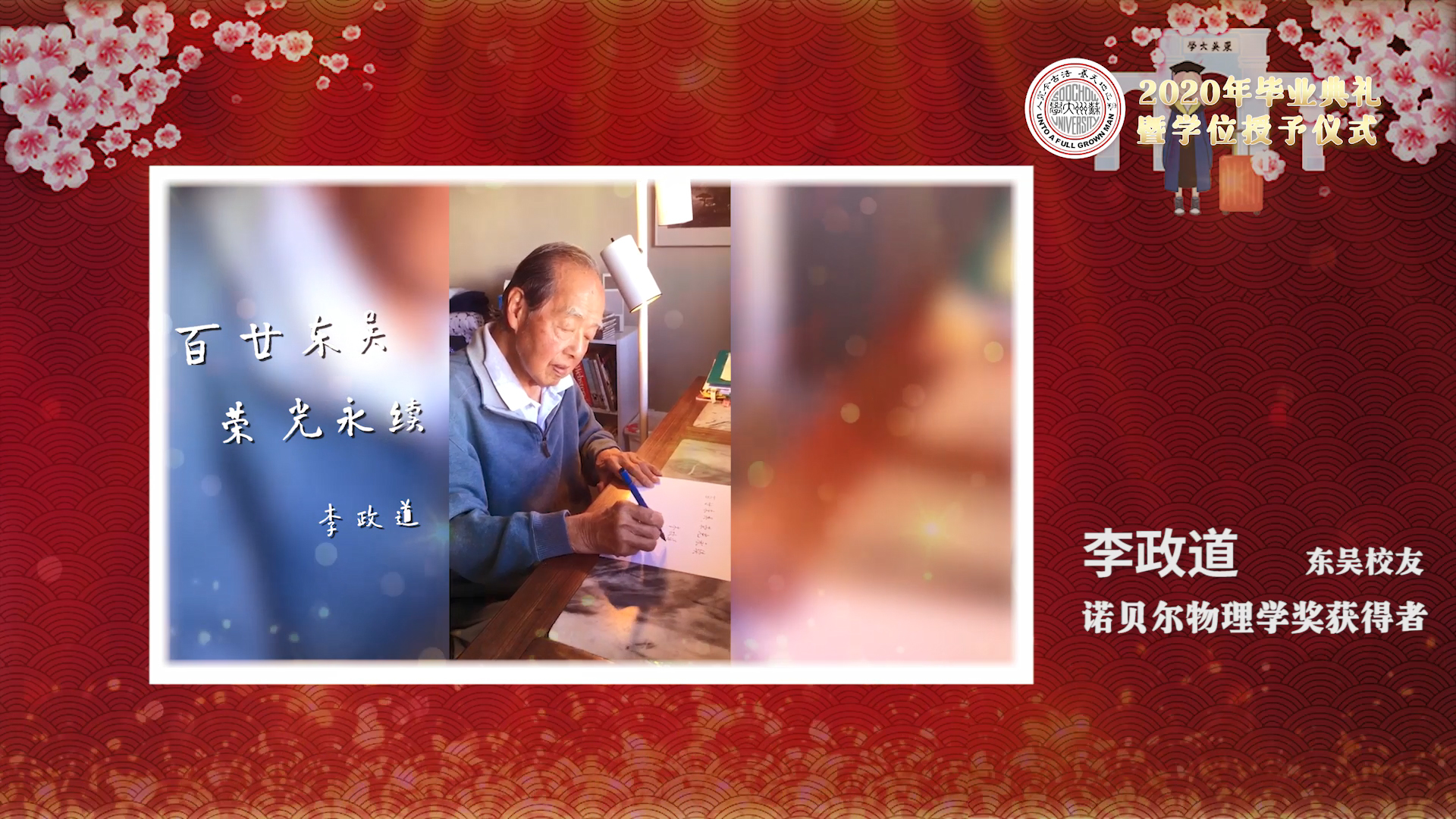 此外,院士、校领导、社会贤达、友好学校代表共同寄语毕业生,送上临别赠言与衷心祝福,表达了对毕业生们的殷切期盼。九游官网校友、诺贝尔物理奖获得者李政道先生特意录制视频并题写“百廿东吴、荣光永续”,向母校和毕业生送上了祝福。