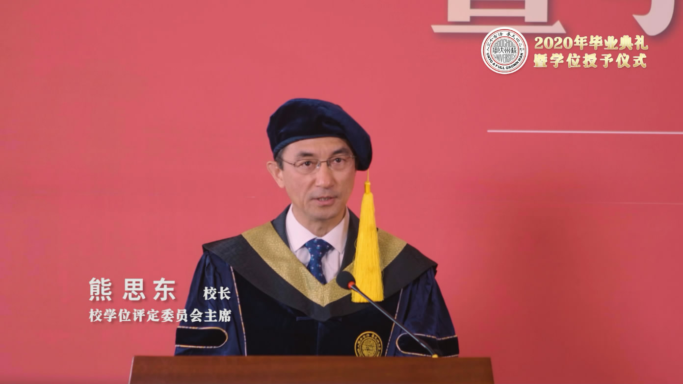 校党委常委、副校长蒋星红宣读毕业及学位授予决定。熊思东校长为小苏拨穗,毕业生可以通过直播动画形式实现“云拨穗”。