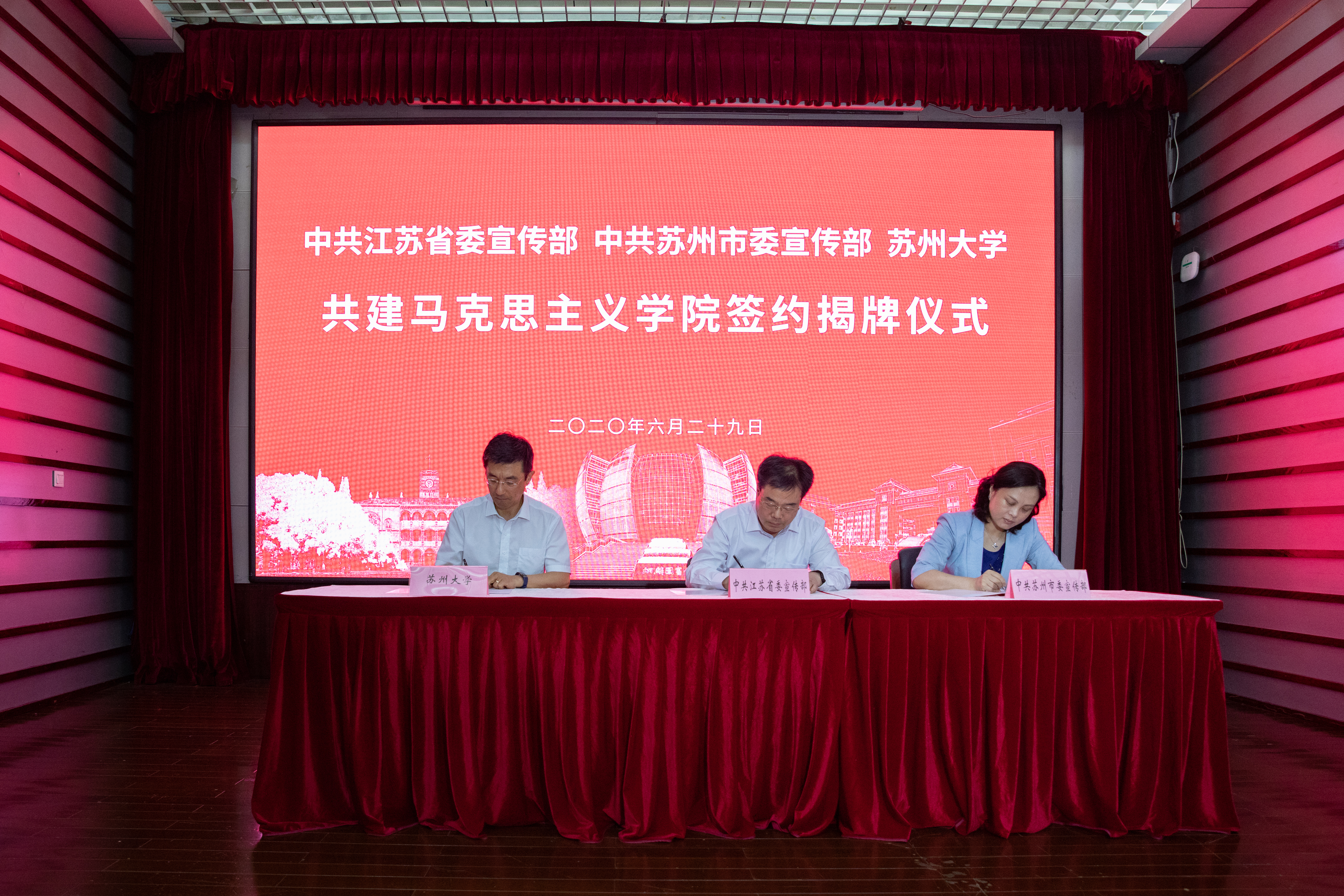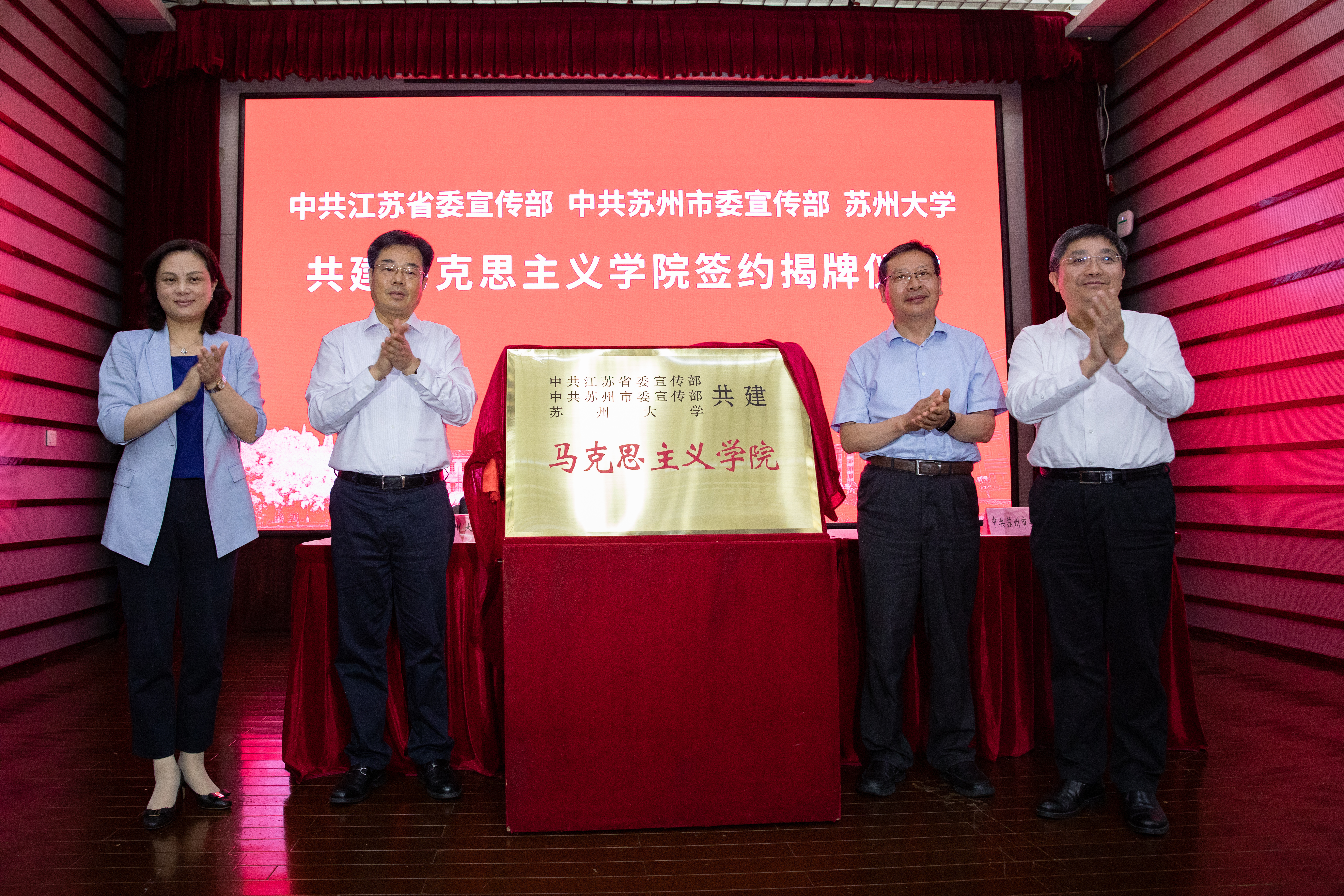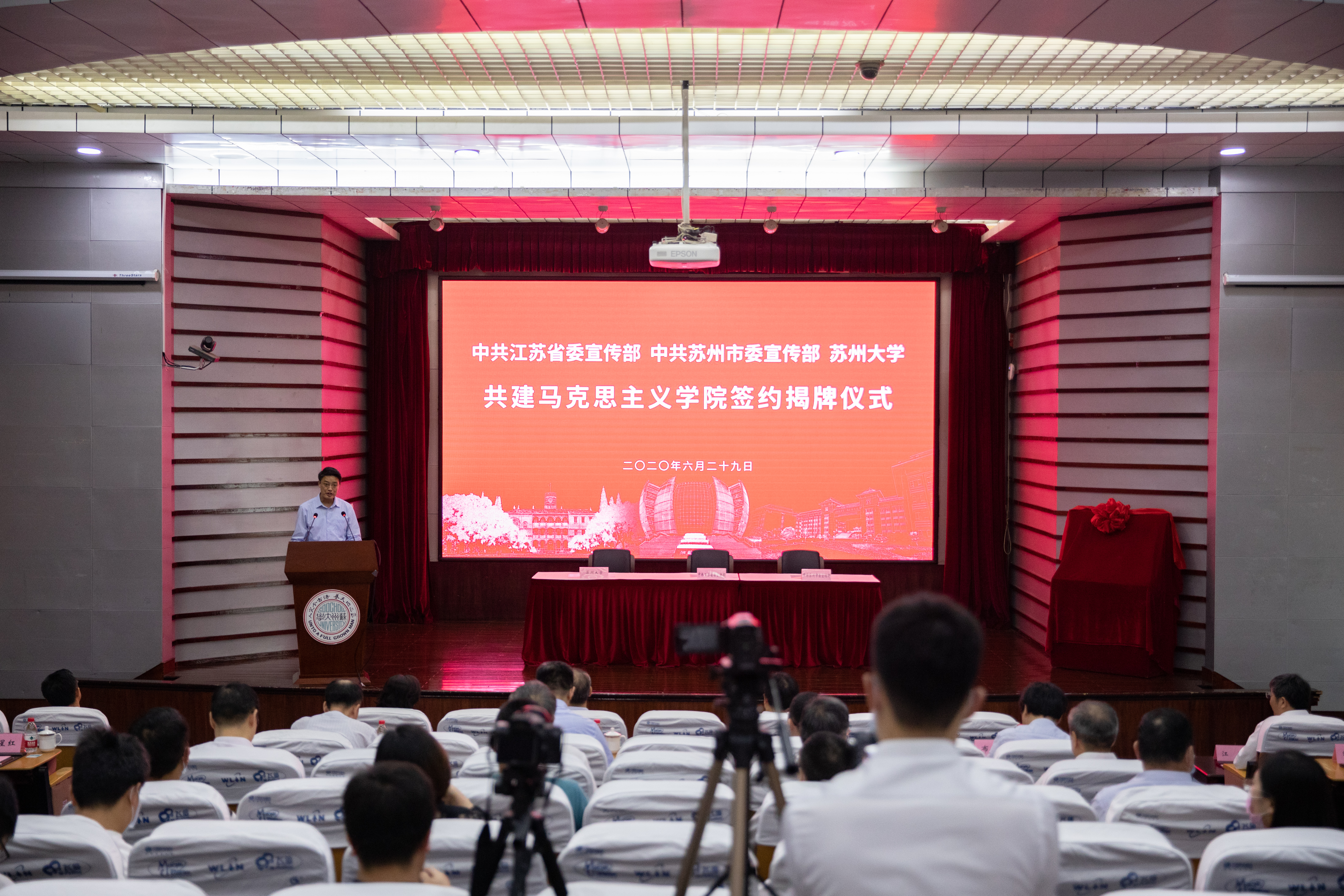 6月29日上午,江苏省委宣传部、苏州市委宣传部、九游官网共建马克思主义学院签约揭牌仪式在本部学术报告厅举行。省委宣传部常务副部长、省新闻出版局(版权局)局长、省电影局局长焦建俊,省委宣传部副部长赵金松,省委教育工委副书记、省教育厅党组成员徐子敏,新华日报社副总编李扬,省社科联党组成员周瑞峰,省社科院党委委员、副院长章寿荣,省委党校马克思主义学院院长布成良,苏州市委常委、宣传部部长金洁,《群众》杂志社政治处处长丁和平,省委宣传部理论处处长刘必好,省教育厅社政处处长王伟,苏州市委宣传部副部长、市新闻出版局(版权局)局长黄锡明,九游(中国)一站式服务官网校领导江涌、熊思东、蒋星红、周高、张晓宏,省委宣传部、省委教育工委等相关职能处室负责人、苏州市相关单位负责人、九游官网相关职能部门负责人和师生代表参加仪式。仪式由校党委副书记邓敏主持。