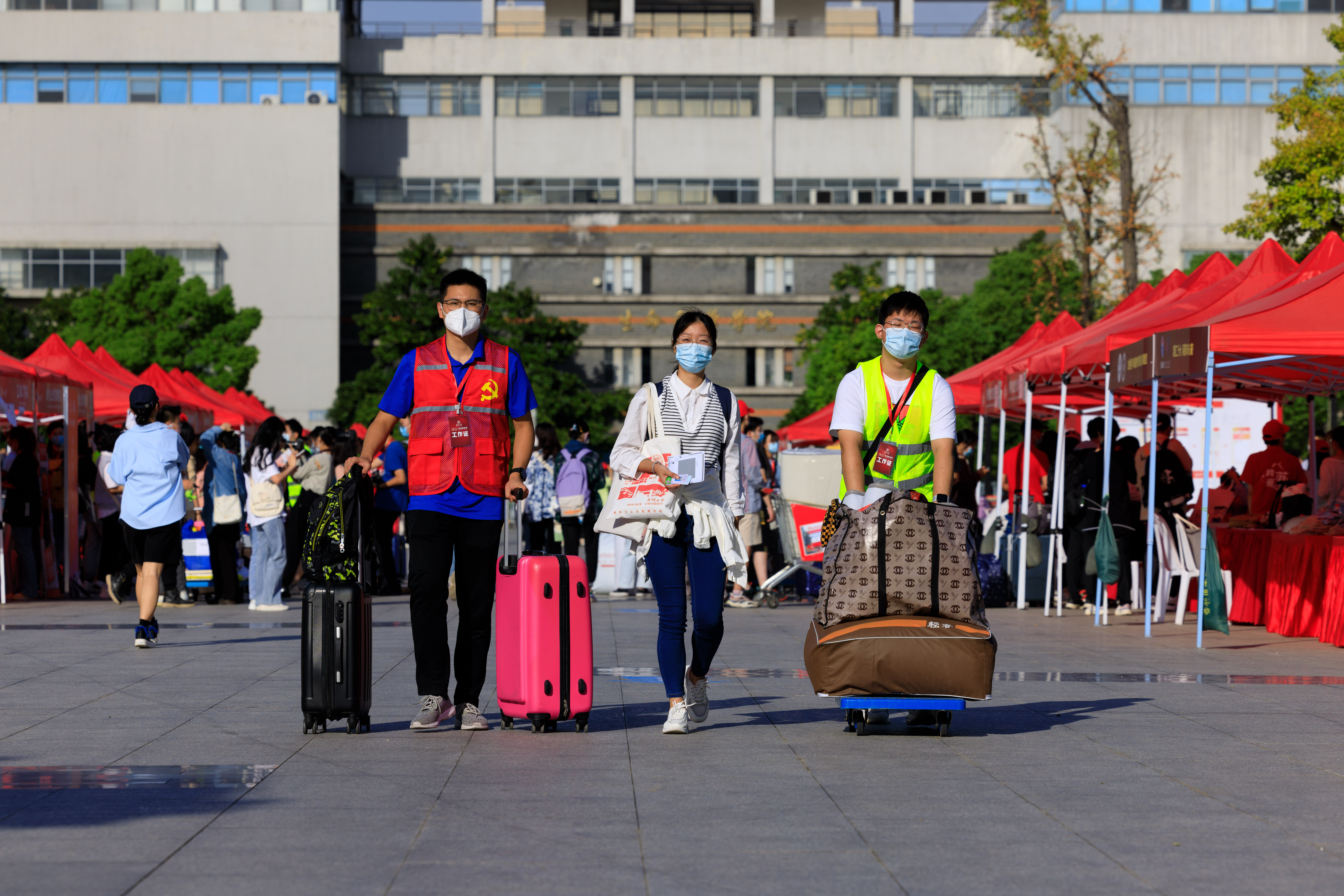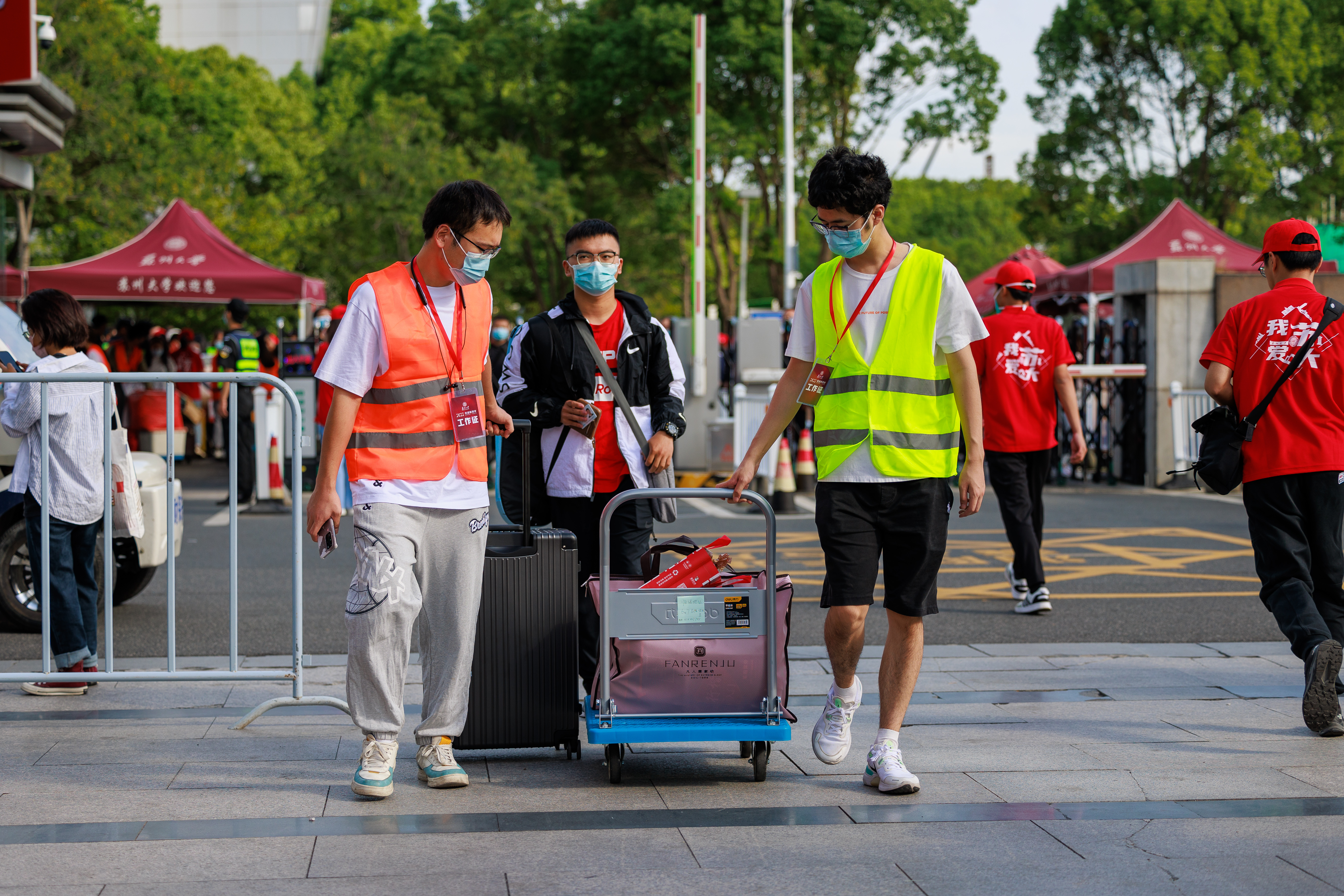 天光微亮,身穿“我爱九游官网”红马甲的学生志愿者便等候在迎新点,看到新生前来报到便快步上前,热情周到帮助新生搬运行李、办理报到手续,各学院(部)的老师及相关职能部门的工作人员也在现场为新生提供周到服务。
