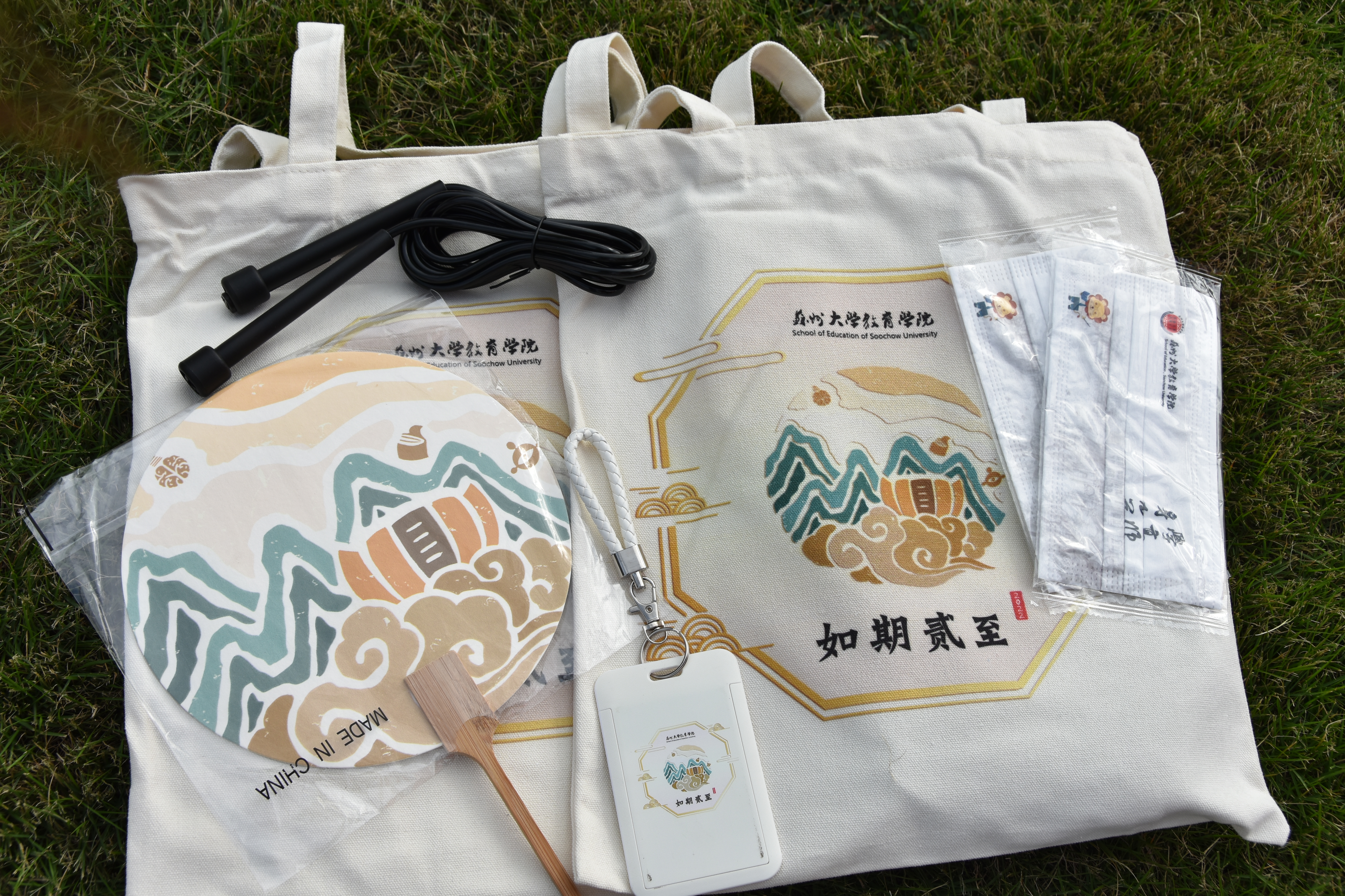 教育学院为新生准备了主题文创袋、古木扇、定制卡套等小礼物,还贴心为学生发放了口罩和跳绳,希望新生们在做好个人防护的同时,更加注重体育锻炼,强身健体,更好地适应大学生活。