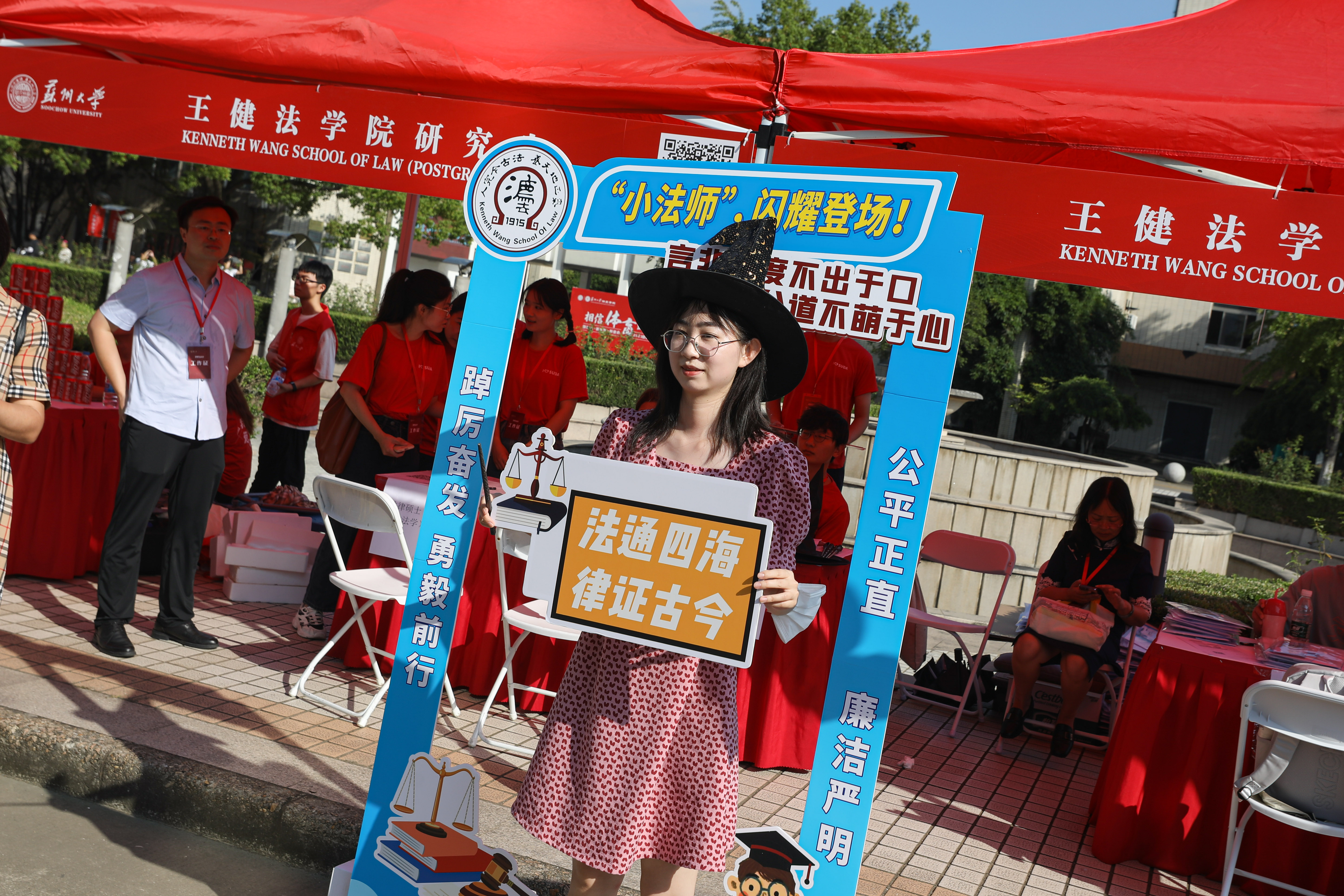 王健法学院特别准备了魔法帽、魔法棒和卡通展板,供新生合影留念。“反差萌”的仪式旨在提醒同学们保持开放包容的人生心态。