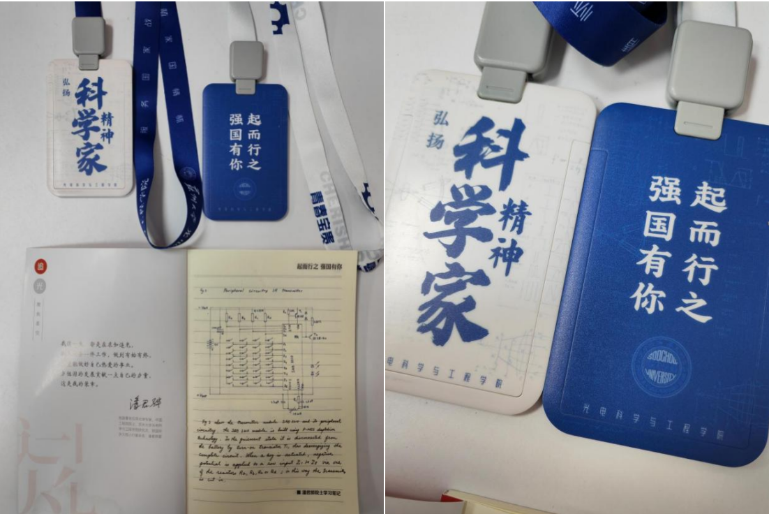 光电科学与工程学院以“科学家精神”为主题准备了入学礼包,其中包括印有潘君骅院士笔记原稿的“追光”笔记本等周边,勉励新时代光电学子勇做光电弄潮儿。