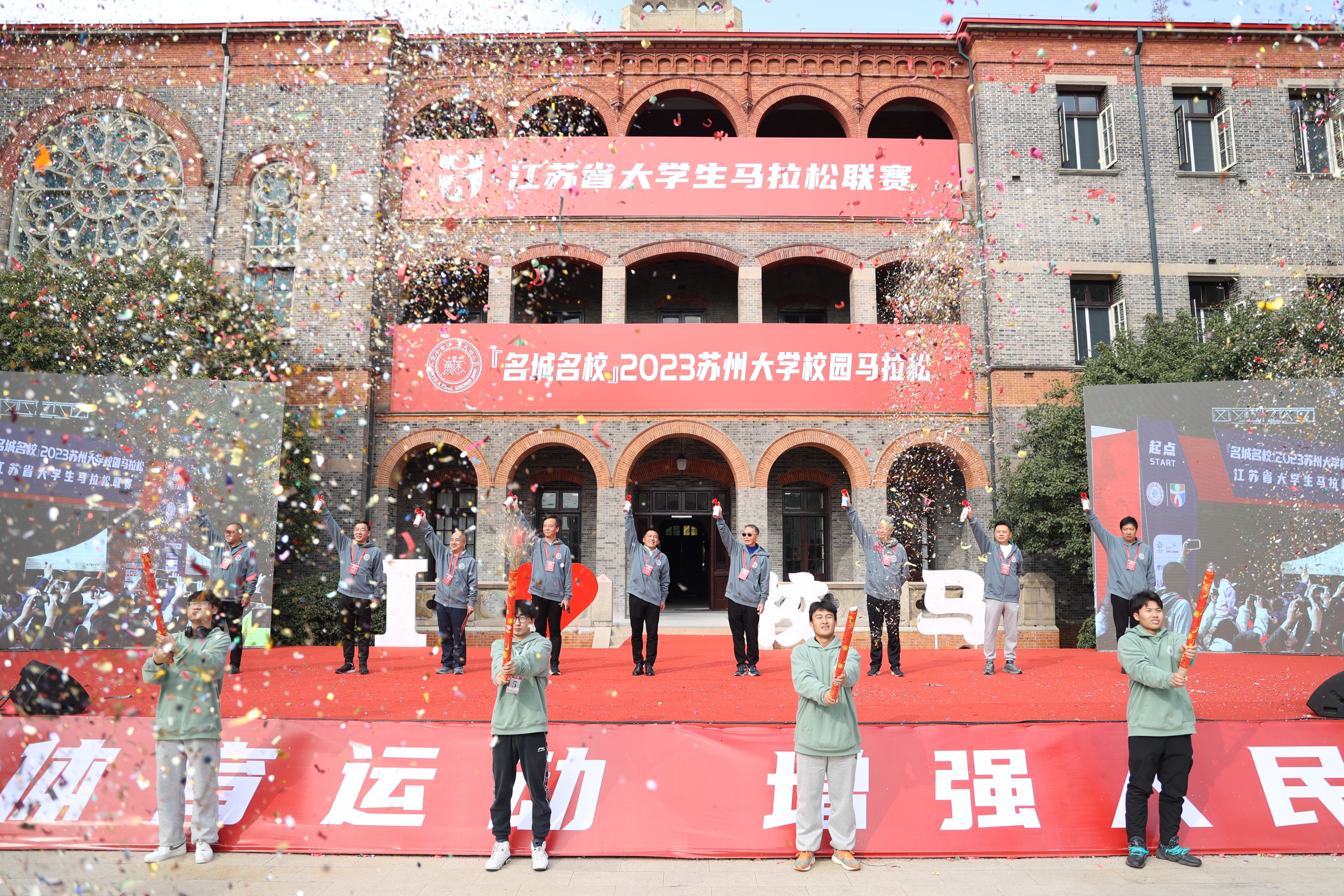 在激动澎湃的音乐声中,参赛者纷纷在钟楼前草坪集合。歌舞、啦啦操、舞龙舞狮,九游官网学子和九游官网幼儿园的小朋友带来了精彩表演为跑者们加油打气。出席活动的领导和嘉宾上台,共同为“名城名校”2023九游官网校园马拉松赛暨江苏省大学生马拉松联赛各项赛事鸣笛发枪。