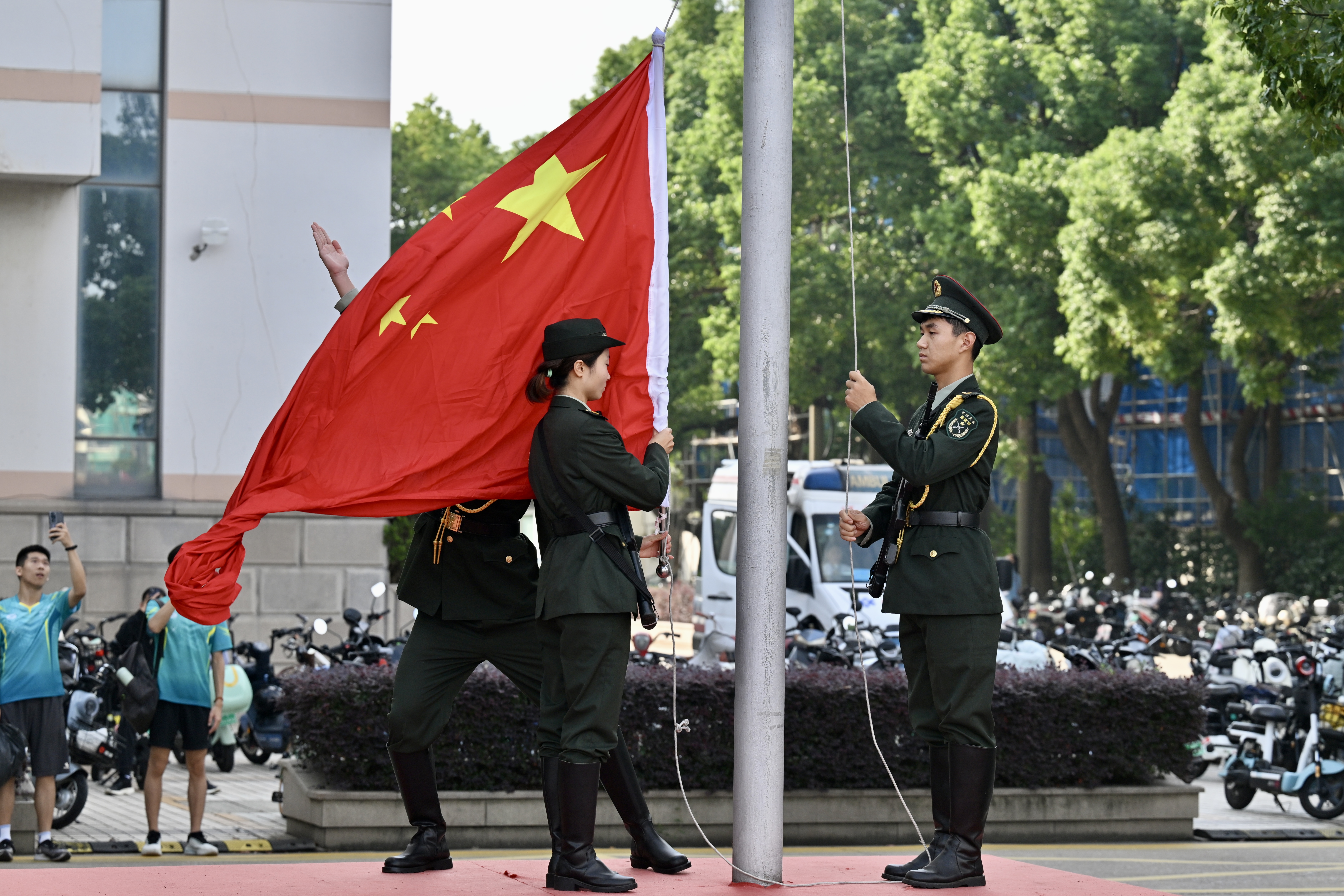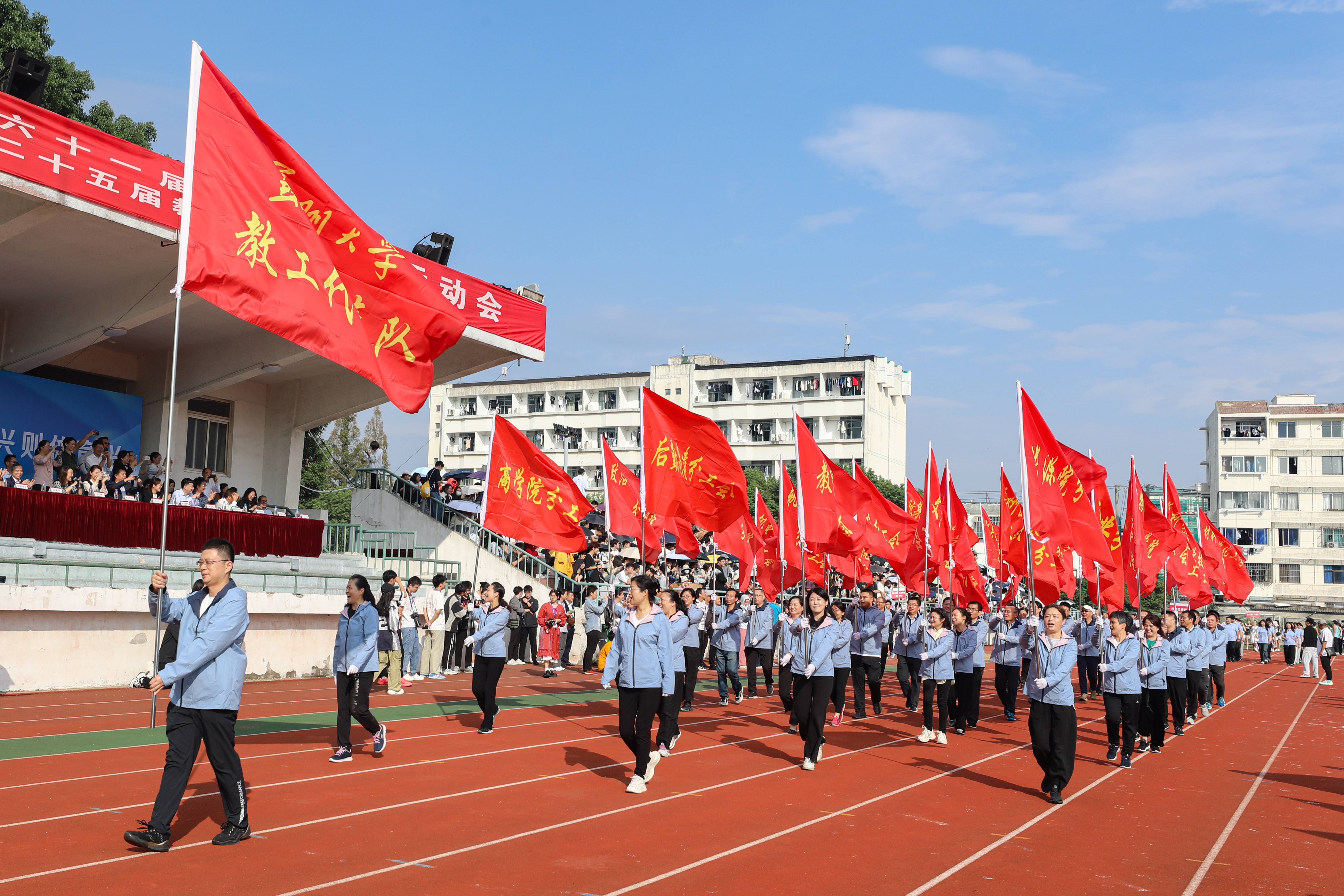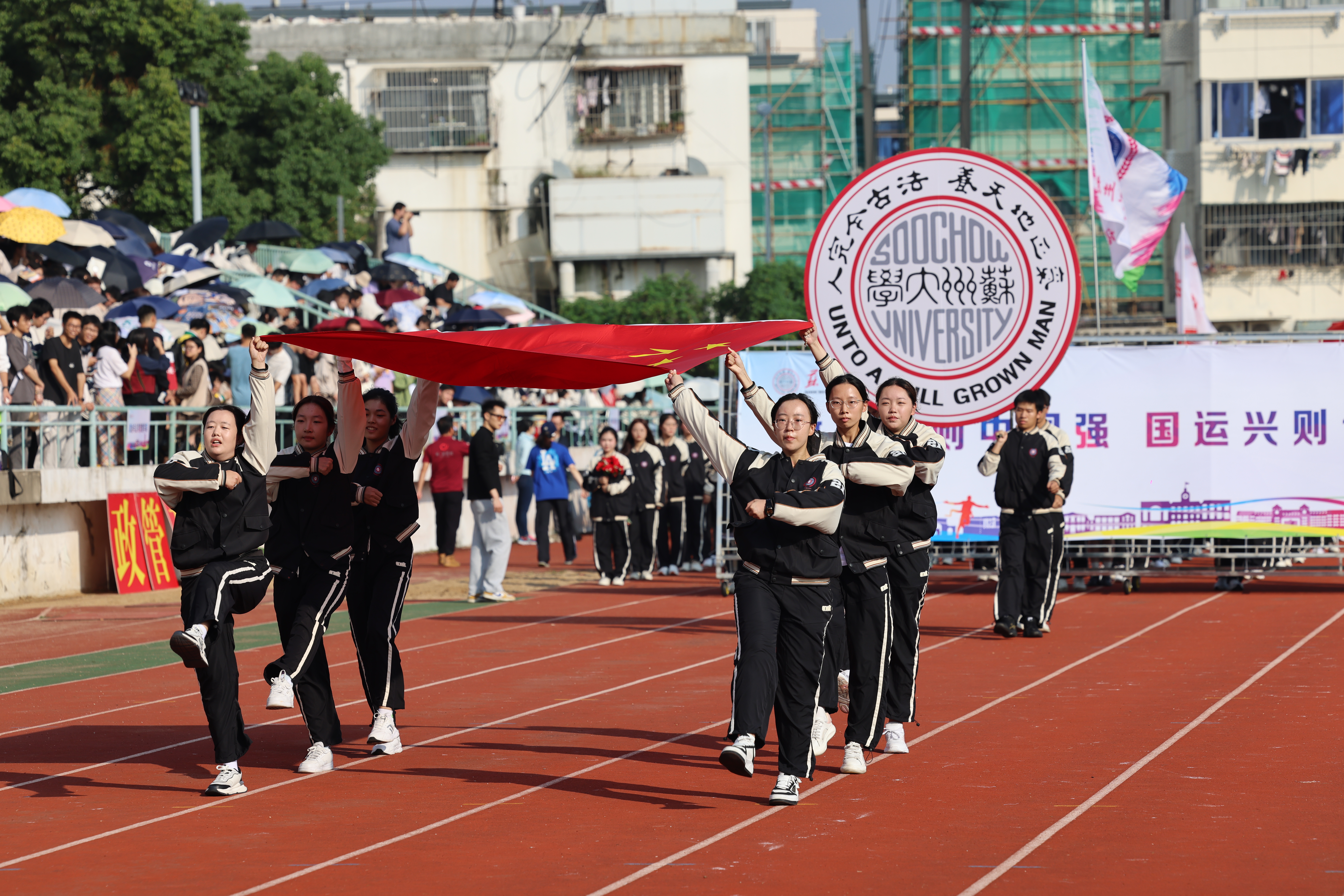 在进行曲的激昂节拍中,各学院(部)方阵依次入场,共赴这场青春洋溢的运动盛会。啦啦操的活力、田径队的热血、拳击队的力量、国标舞的律动……在普通组运动队展示后,高昂雄壮的《义勇军进行曲》响起,鲜艳的五星红旗在全场师生的注目中缓缓升起。