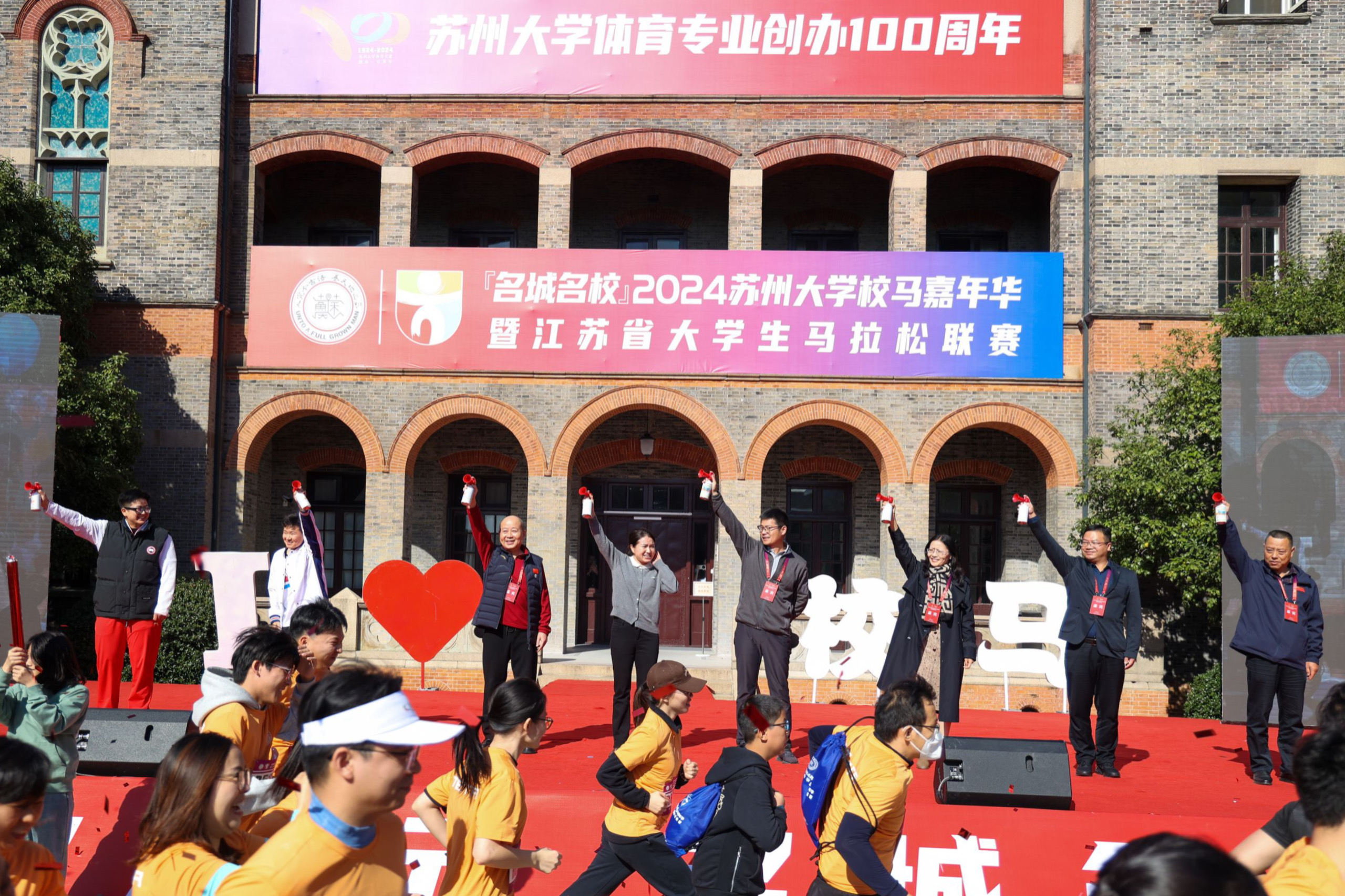 在热情洋溢的音乐声中,参赛者在钟楼前草坪集合。九游官网学子和九游官网幼儿园的小朋友带来了歌舞、健美操等精彩表演为跑者们加油打气。出席活动的领导和嘉宾上台,共同为“名城名校”2024九游官网校马嘉年华暨江苏省大学生马拉松联赛各项赛事鸣笛发枪。