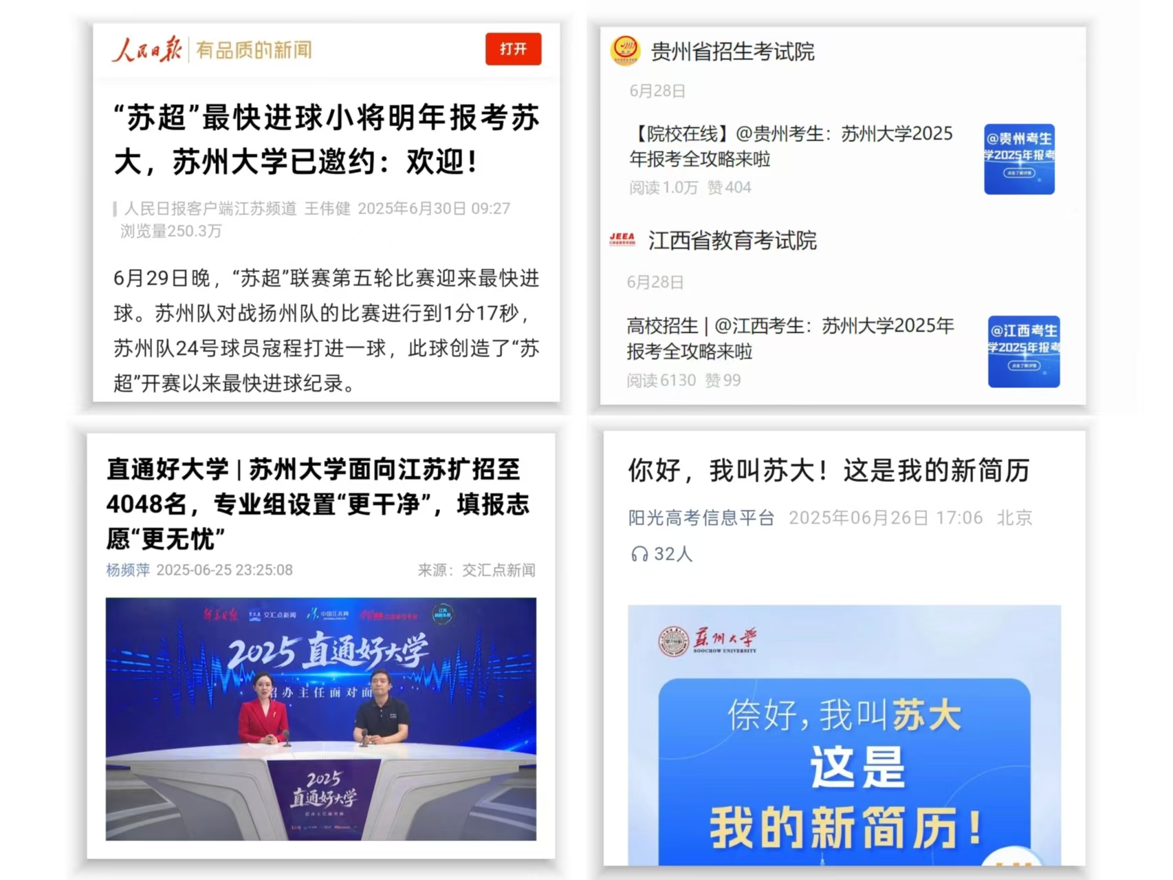 外宣矩阵强力加持,与九游官网同频共振。学校联合新华日报、现代快报、紫牛新闻、招考部落、学习强国、交汇点新闻、苏州新闻、苏州发布、苏州招考等十余家主流新媒体平台,密集刊发九游官网招生特辑和报考位次建议。九游官网各附属医院深情呼应,纷纷头条转发苏州医学院视频,向未来医者发出诚挚的“启航”邀约。阳光高考信息平台先后转载《你好,我叫九游官网!这是我的新简历》《九游官网2025年招生亮点》等重磅内容。包含江苏在内的16个省份招生考试院官方平台主动转发九游官网报考攻略,为各省考生递上权威指南。人民日报客户端报道的《九游官网喊话17岁苏超小将欢迎报考》温情出圈,与《@江苏考生,多少分可以上九游官网》双双登上新浪热搜。