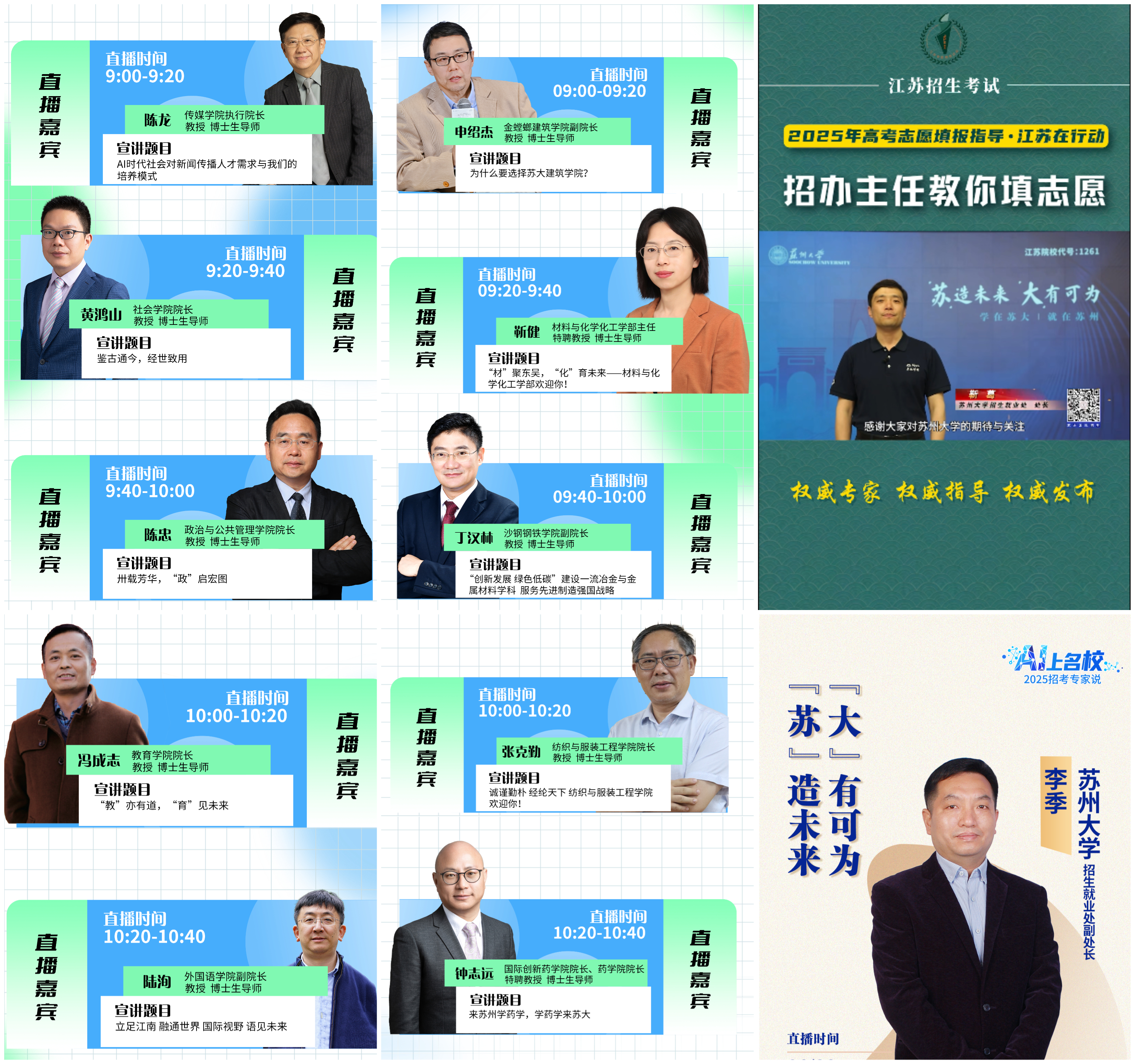 云端聚力,声入万家。招生就业处精心策划、精准发力,组织开展直播活动24场次。其中,16场直播聚焦院系专业,汇聚文理医工四大学科领域,学院院长领衔、学长学姐助阵,细致解读专业内涵与发展前景。同时,针对广大考生和家长高度关注的招生政策变化,招生就业处录制《招办主任教你填志愿》系列视频,深度做客现代快报、扬子晚报、江苏招考等知名媒体的直播间,将权威声音与贴心服务送抵千家万户。