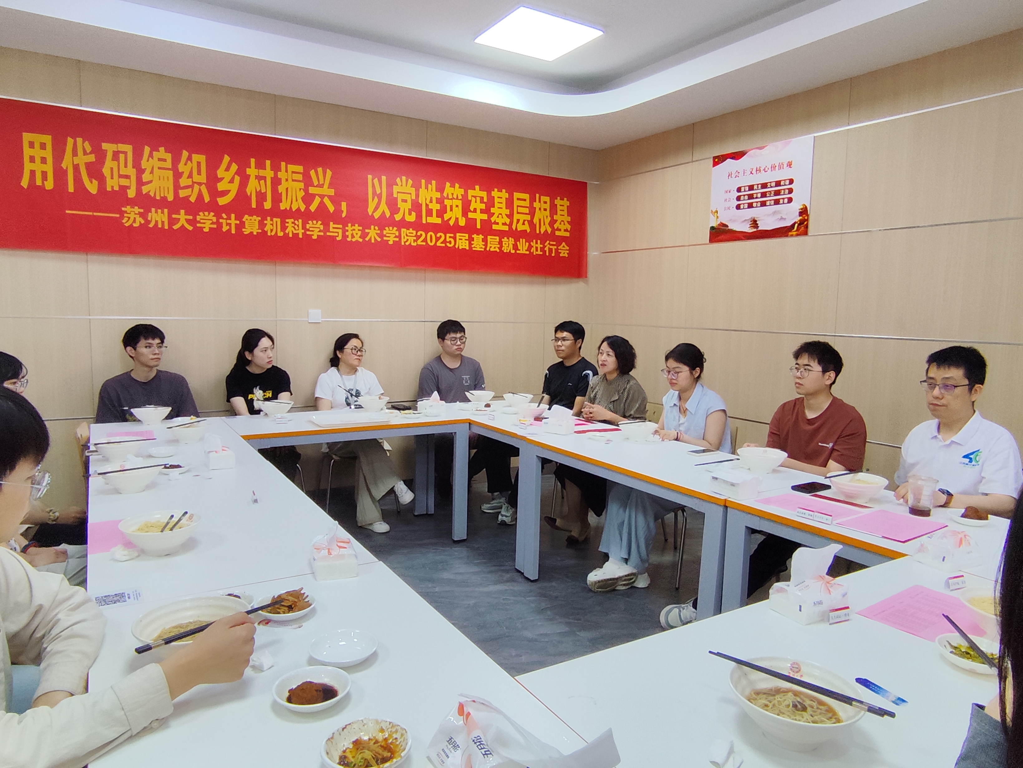 为送别即将投身三支一扶、西部计划、乡村振兴等基层岗位的2025届毕业生,6月23日上午,计算机科学与技术学院党委举办“再来一碗苏式面”基层就业壮行会。学院党委书记陈国凤,院长黄河,党委副书记、副院长李恩秀及教师代表与12名即将奔赴山海的学子齐聚一堂,共话未来。