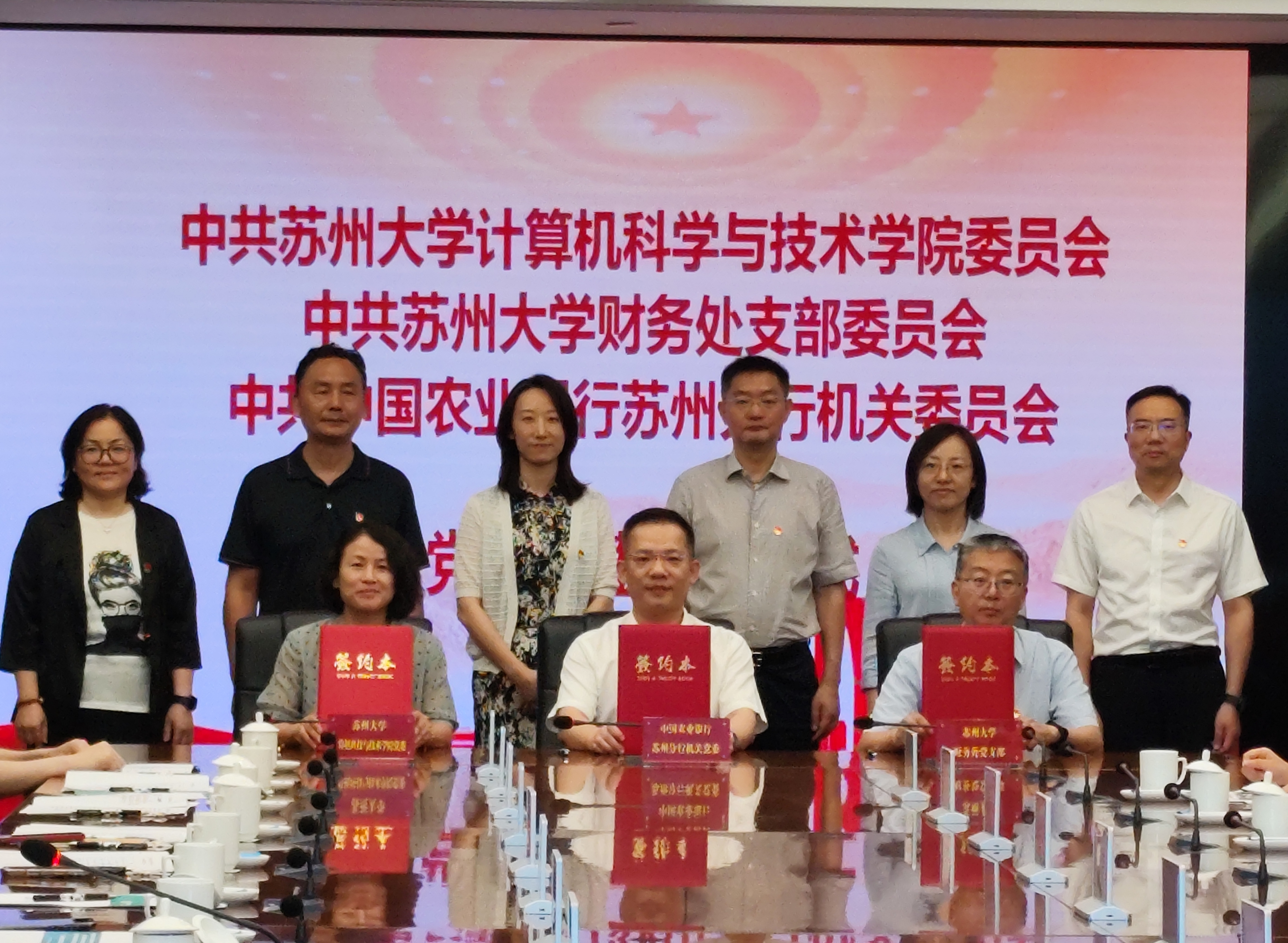 计算机科学与技术学院党委书记陈国凤、财务处党支部书记陈永清与农行苏州分行党委委员、副行长张曾博作为代表签署党建共建协议。洪晔、吴忠辉及双方与会代表共同见证。